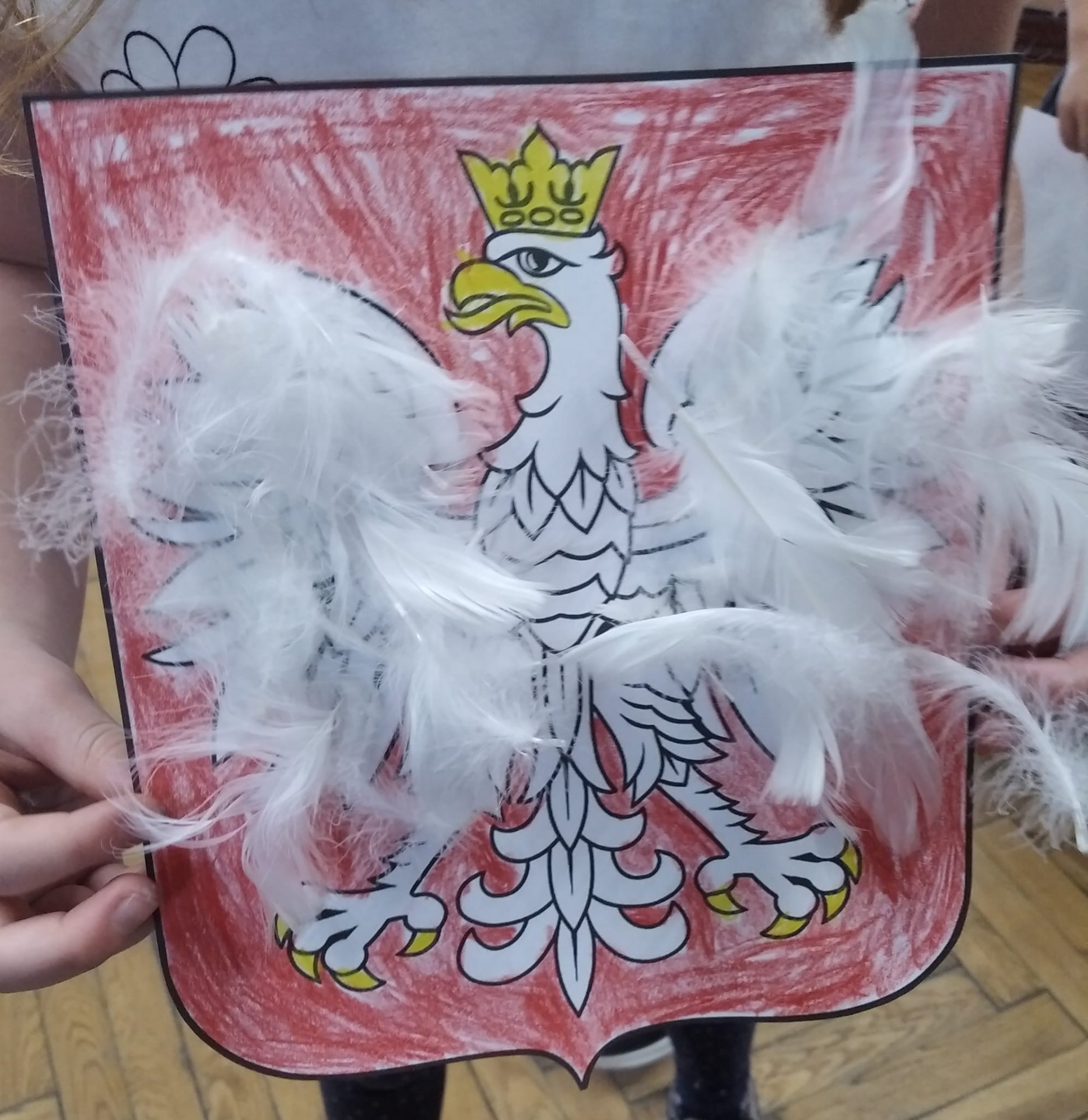 Wykorzystując proste materiały plastyczne - kredki i piórka - dzieci wykonały jeden z polskich narodowych symboli: białego orła w koronie na czerwonej tarczy. Przedszkolaki wiedziały też o zbliżającym się Dniu Bibliotekarza i Bibliotek, który obchodzić będziemy 8 maja. Zaskoczyły miło swoją bibliotekarkę wspaniałą laurką i przemiłymi życzeniami.