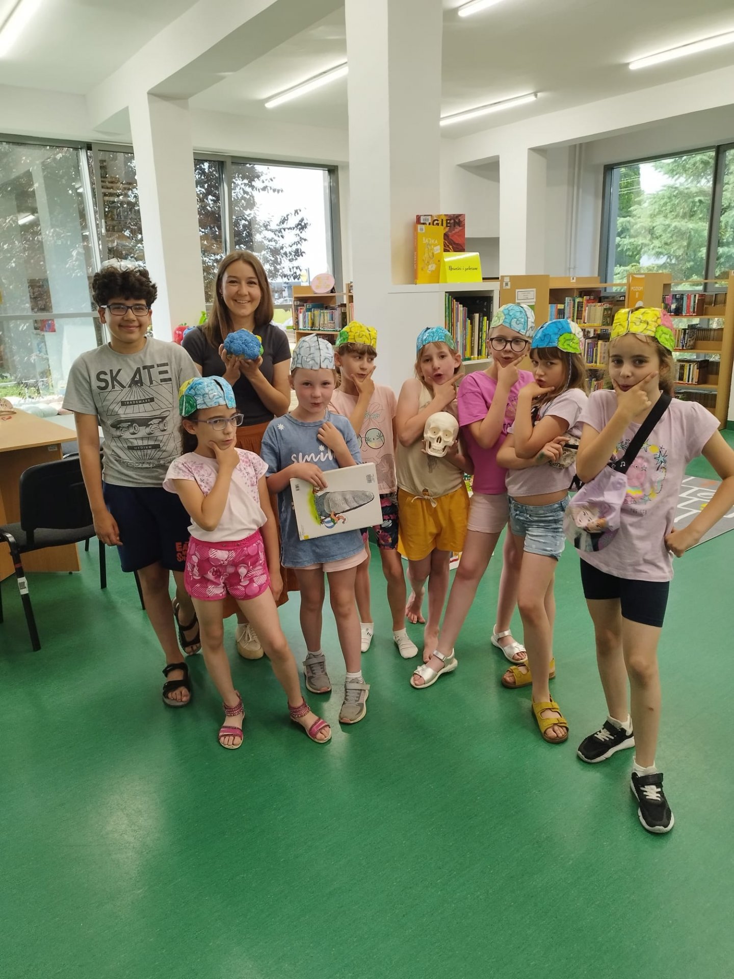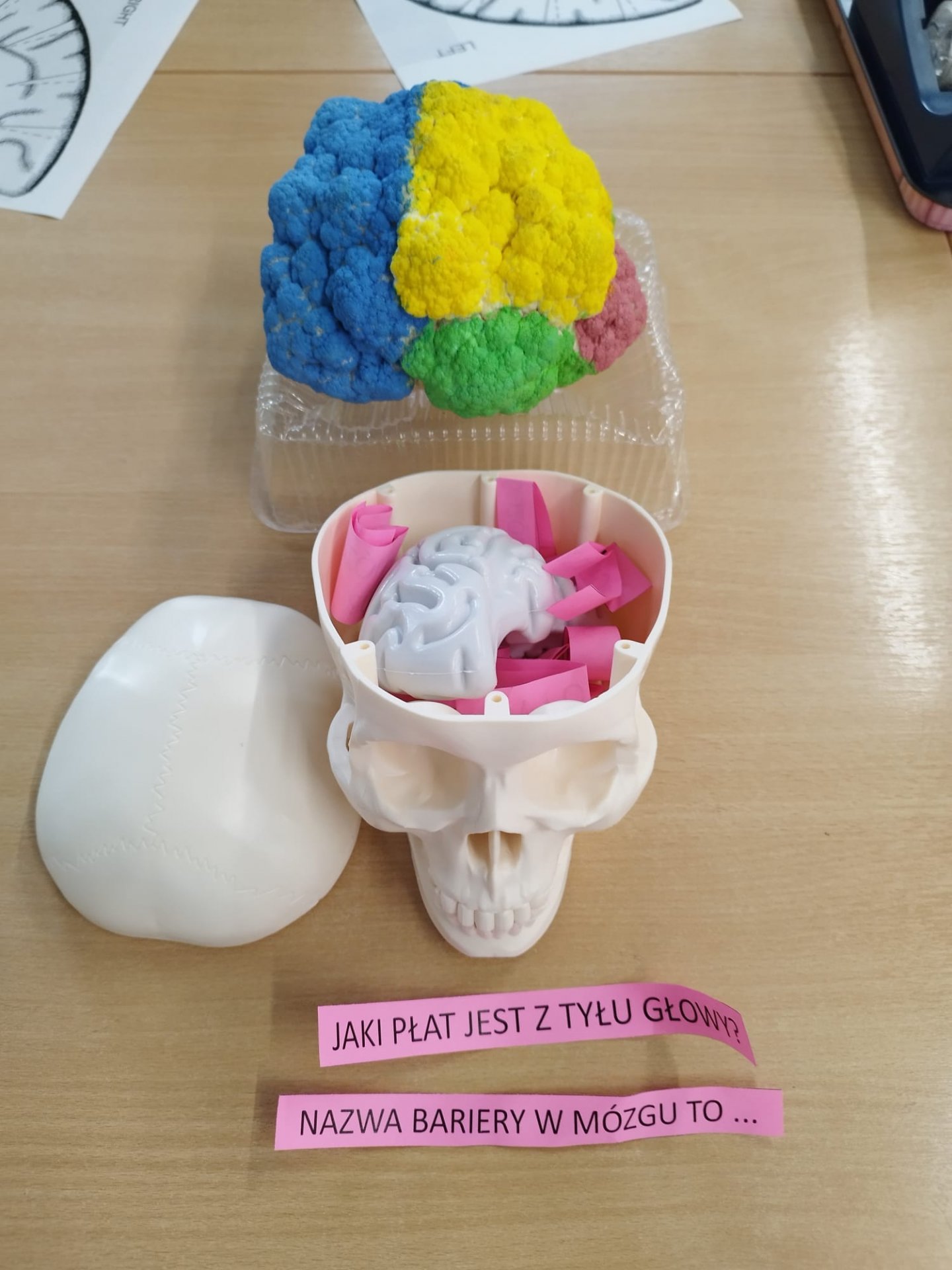 W trakcie czerwcowego spotkania za pomoce naukowe służyły dzieciom edukacyjne ilustracje, plastikowy odlew czaszki oraz kalafior!, który stanowi bardzo dobry model mózgu. W części praktycznej, każdy uczestnik stworzył mózgową czapkę, którą mógł założyć na głowę, by przekonać się bez użycia tomografu, gdzie znajdują się poszczególne ośrodki.
