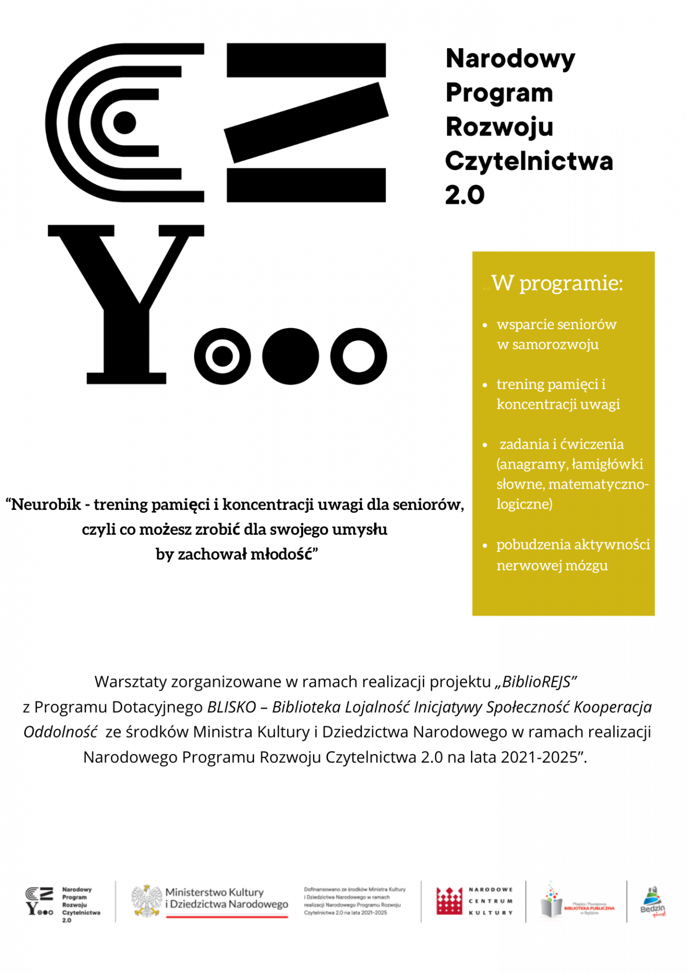 Projekt BiblioREJS - warsztaty pt.: „Neurobik – trening pamięci i koncentracji uwagi dla seniorów, czyli co możesz zrobić dla swojego umysłu by zachował młodość”