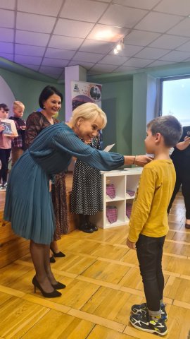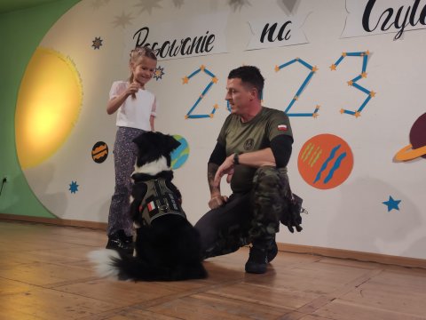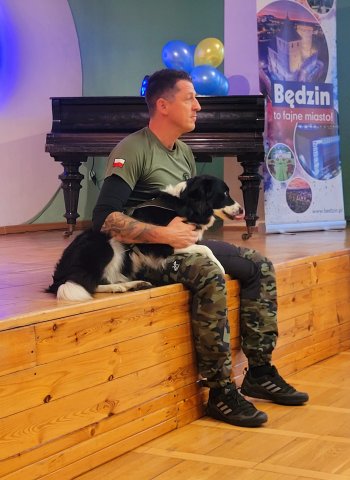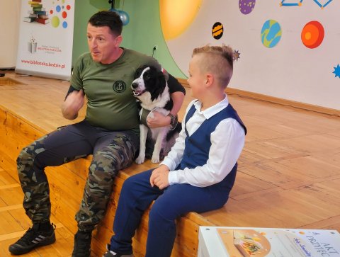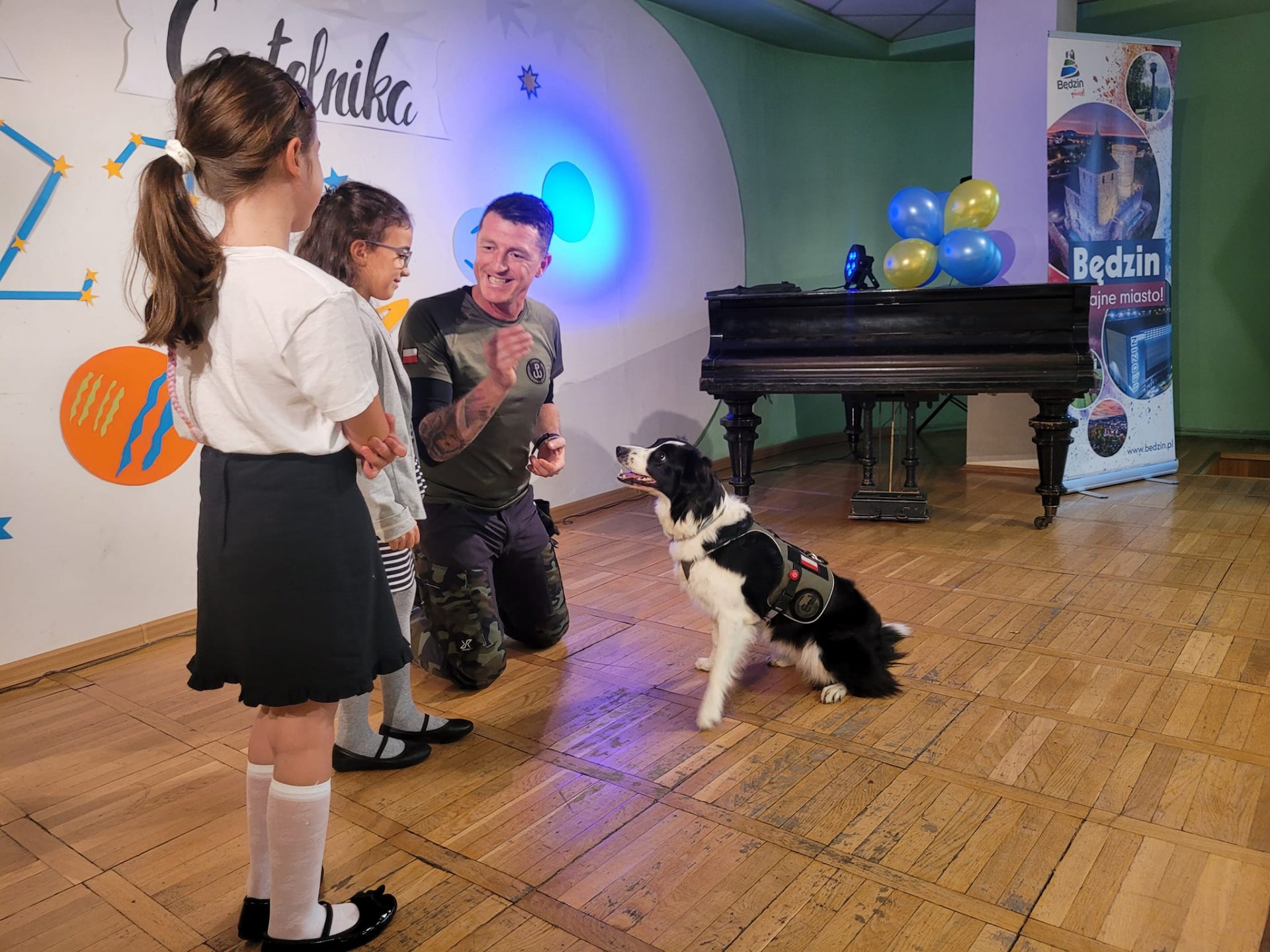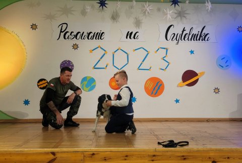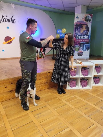 Biblioteka stara się także poprzez zajęcia i udział w akcjach społecznych edukować i uwrażliwiać dzieci na dobro zwierząt. Uroczystość Pasowania była wspaniałą okazją, aby zaprosić wyjątkowych gości, którzy na co dzień pracują – i wykonują niezwykle ważną pracę - jako duet. Gośćmi był Pan Arkadiusz Pilszczka z 13 Śląskiej Brygady Obrony Terytorialnej (grupa K9) oraz jego partner, 2 i pół letnia Figa - przedstawicielka rasy Border Collie, która jest psem poszukiwawczo-ratowniczym. Dzieci miały okazję wysłuchać mądrego wykładu na temat tego, jak witać się z psem oraz pod czujnym okiem Pana Arkadiusza sprawdzić jak wiele komend i ciekawych sztuczek zna Figa, która jest psem doskonale wyszkolonym, posłusznym i łagodnym. I nie trzeba pisać, jak jej popisy skradły serca zarówno dzieci jak i dorosłych. Figa, która współpracuje już od kilku miesięcy z osobami niepełnosprawnym w naszej bibliotece otrzymała podczas wczorajszego spotkania specjalną zawieszkę, przygotowaną przez firmę Drapula, z ozdobnym grawerem „Psitelnik Figa”. Wierzymy, że ten wieczór przyniósł dzieciom wiele niezapomnianych chwil radości, a ich kolejne wizyty w bibliotece i kontakt z książkami będzie niekończącą się przygodą z fascynującym światem wiedzy i literatury.