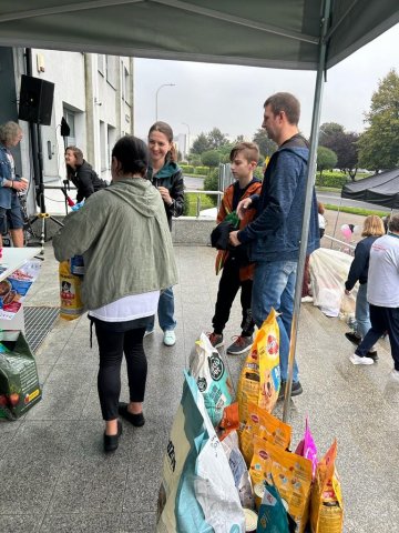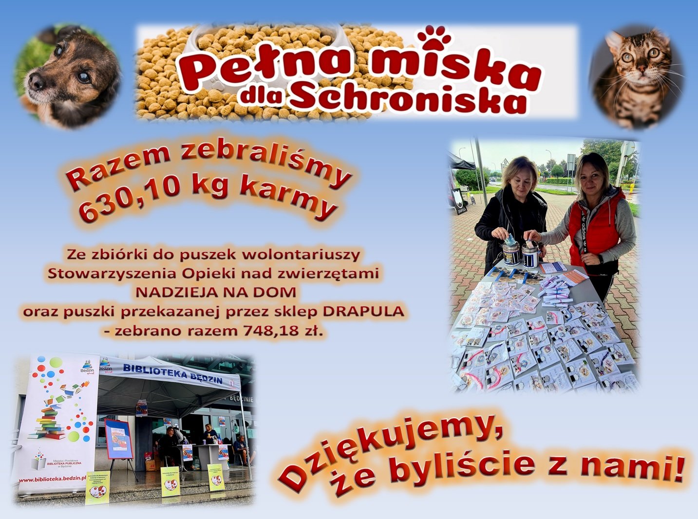 Słowa uznania kierujemy dla uczniów i opiekunów ze szkół podstawowych nr 10 oraz nr 13 za przygotowane atrakcje, występy uczniów i włączenie się do organizacji wydarzenia. Dziękujemy przedstawicielom sklepu Drapula za udział w akcji oraz liczne akcesoria dla naszych czteronożnych przyjaciół. Dziękujemy wszystkim uczniom, opiekunom oraz rodzicom ze Szkoły Podstawowej nr 11 im. Władysława Broniewskiego w Będzinie, Szkoły Podstawowej nr 8 im. Jana Pawła II w Będzinie oraz I Liceum Ogólnokształcącego im. Mikołaja Kopernika w Będzinie za zorganizowanie zbiórki karmy, nakrętek oraz materiałów na legowisko na terenie szkół. Ze zbiórki do puszki wolontariuszy Stowarzyszenia Opieki nad zwierzętami Nadzieja na Dom oraz puszki przekazanej przez sklep DRAPULA zebraliśmy razem 748 złotych i 18 groszy.