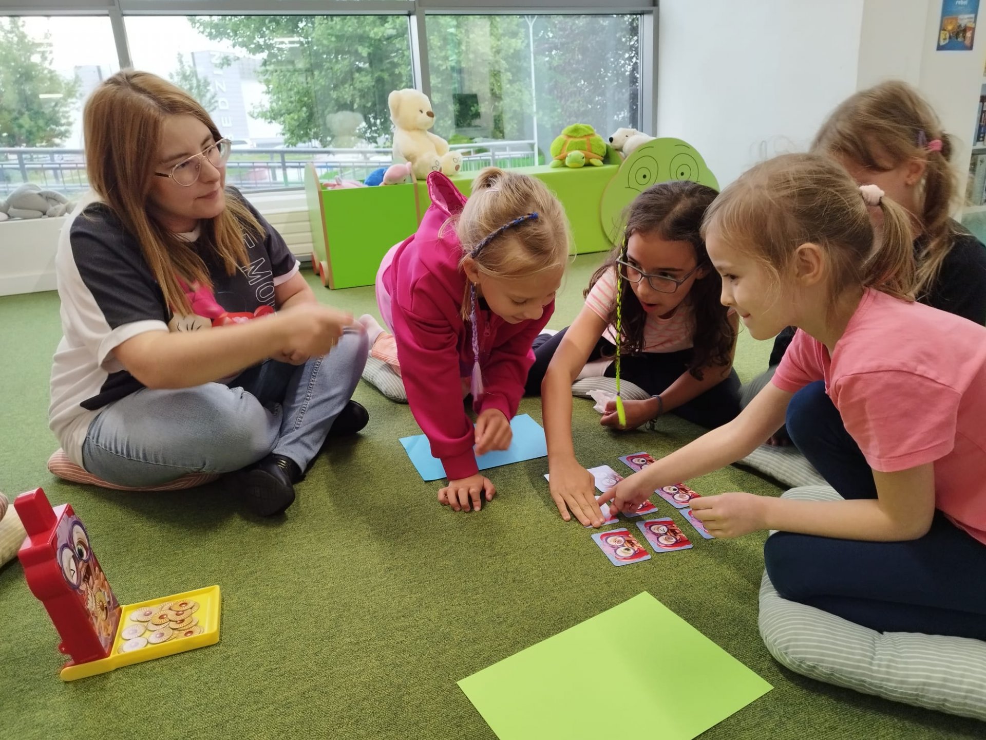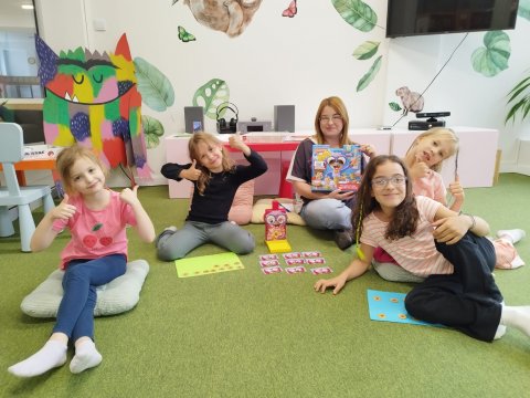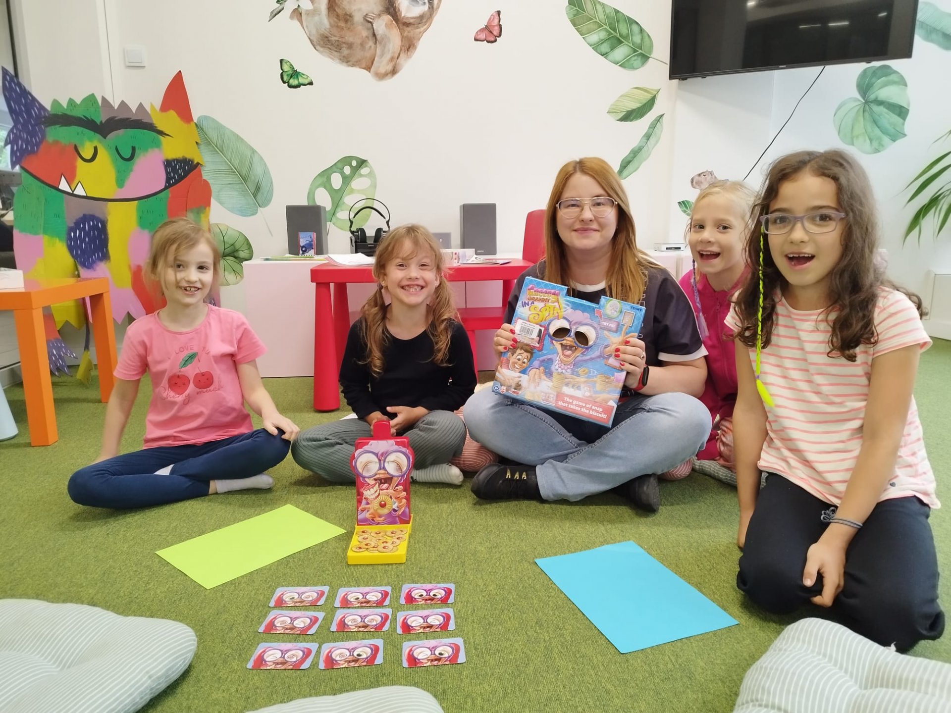 Na kolejnych planszówkach mieliśmy zawrót głowy. Wszystko to za sprawą gry „Wielkie gały babci”. Naciśnij przycisk nad głową babci i zobacz, jak wirują jej oczy. Spójrz szybko jakie szalone spojrzenie ma babcia i znajdź taką samą kartę! Pierwsza osoba, która dopasuje kartę do twarzy Babci, zostanie nagrodzona zabawkowymi ciasteczkami. Gracz z największą liczbą ciasteczek wygrywa. Super zabawa rozwijająca koordynację wzrokowo- ruchową. Czy zaryzykujesz dla ciastka? A może twój ruch obudzi babcię? Uważaj na oczy babci! Ach co to była za rozgrywka! W tej humorystycznej wirówce wygrała grupa zielona. Spotkanie miało charakter edukacyjny, który wpisuję się w realizację 4 Celu Zrównoważonego Rozwoju ONZ "Dobra jakość edukacji”.