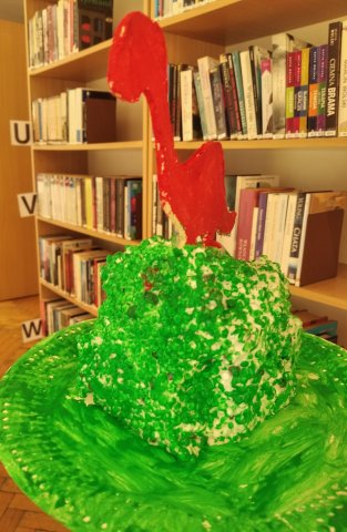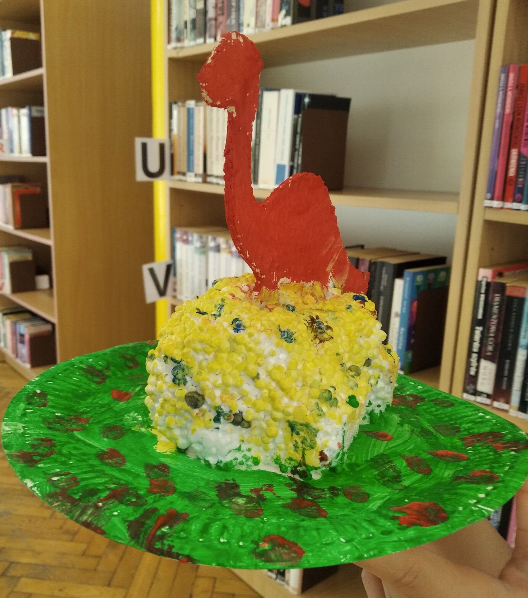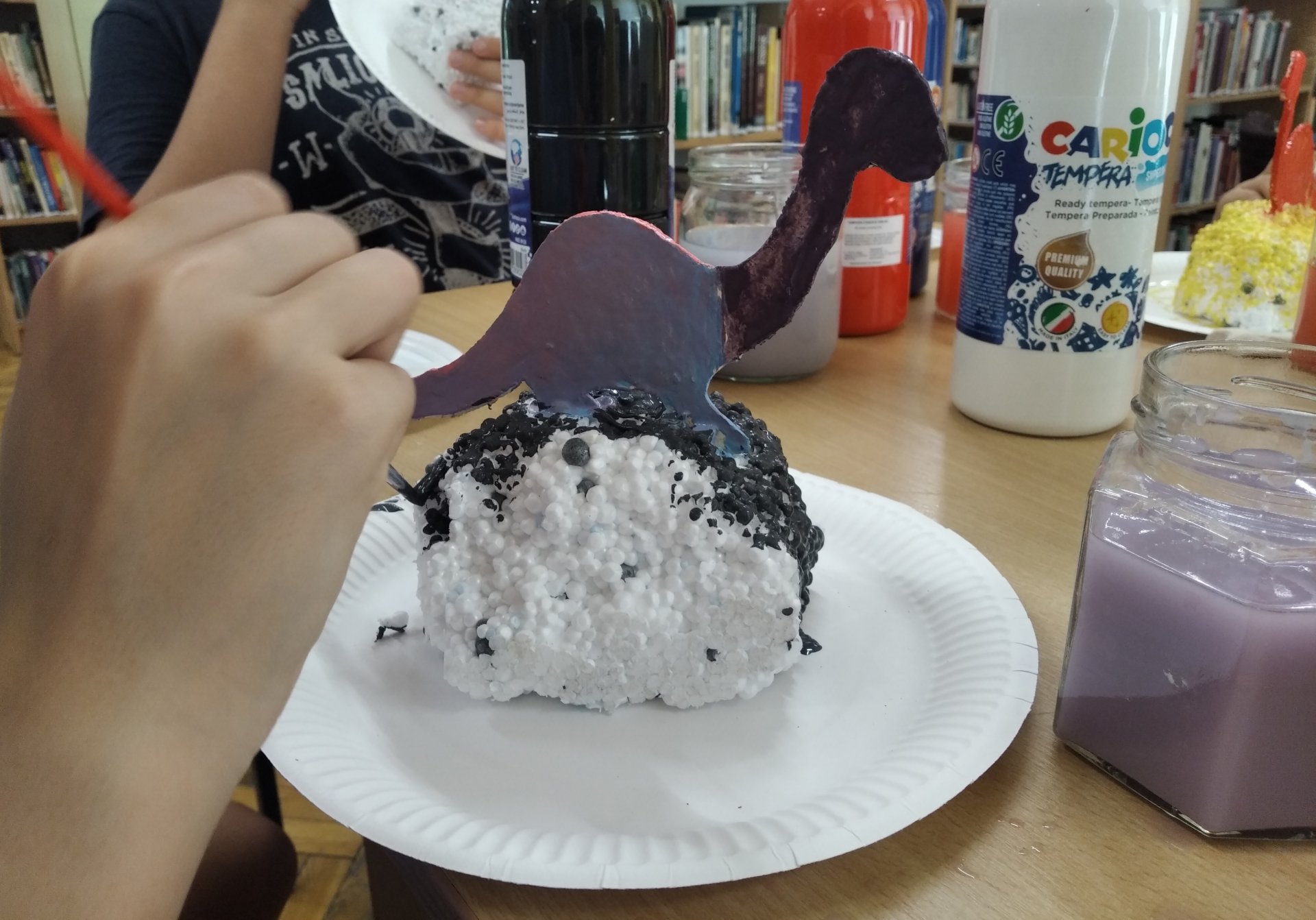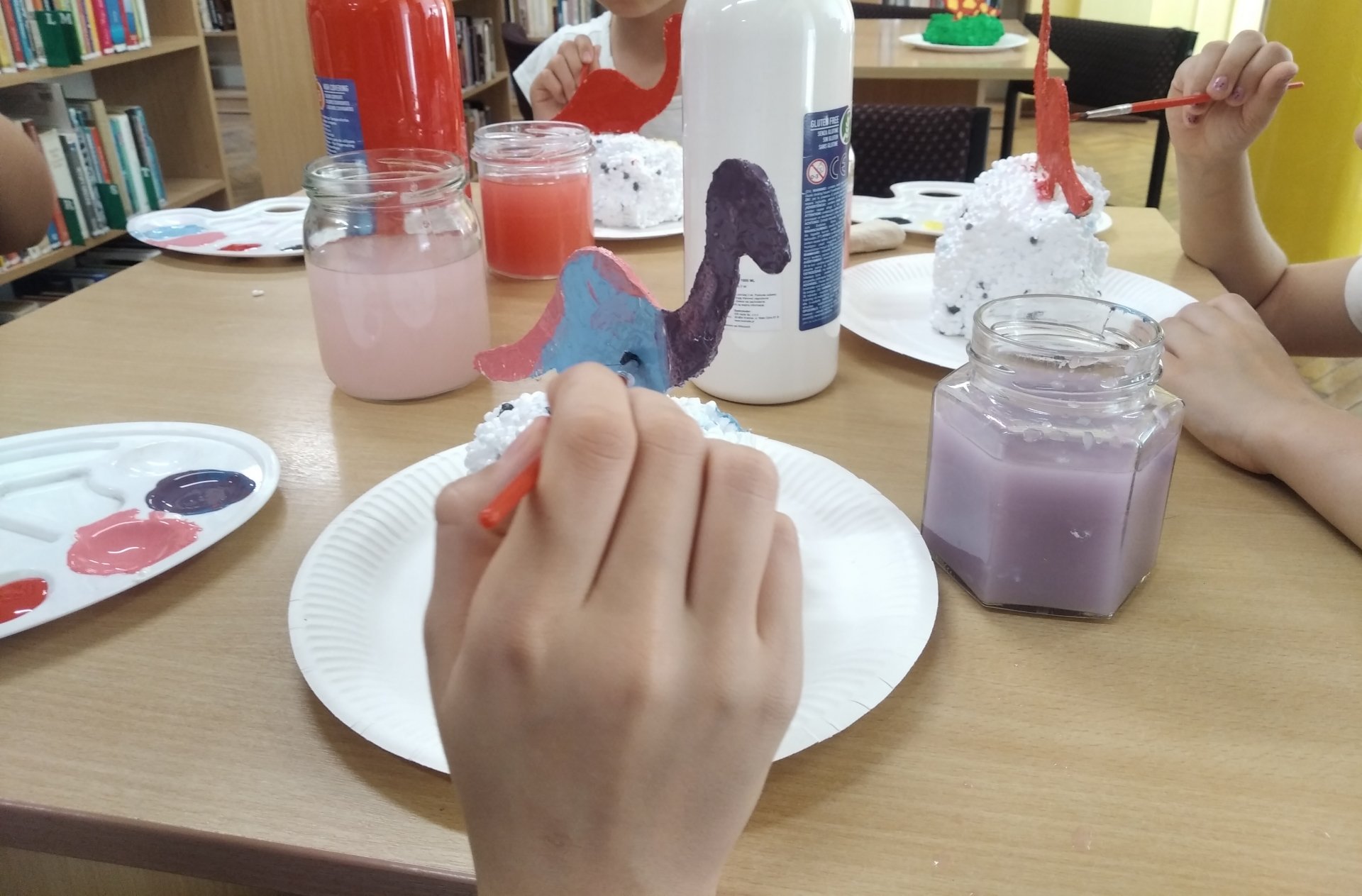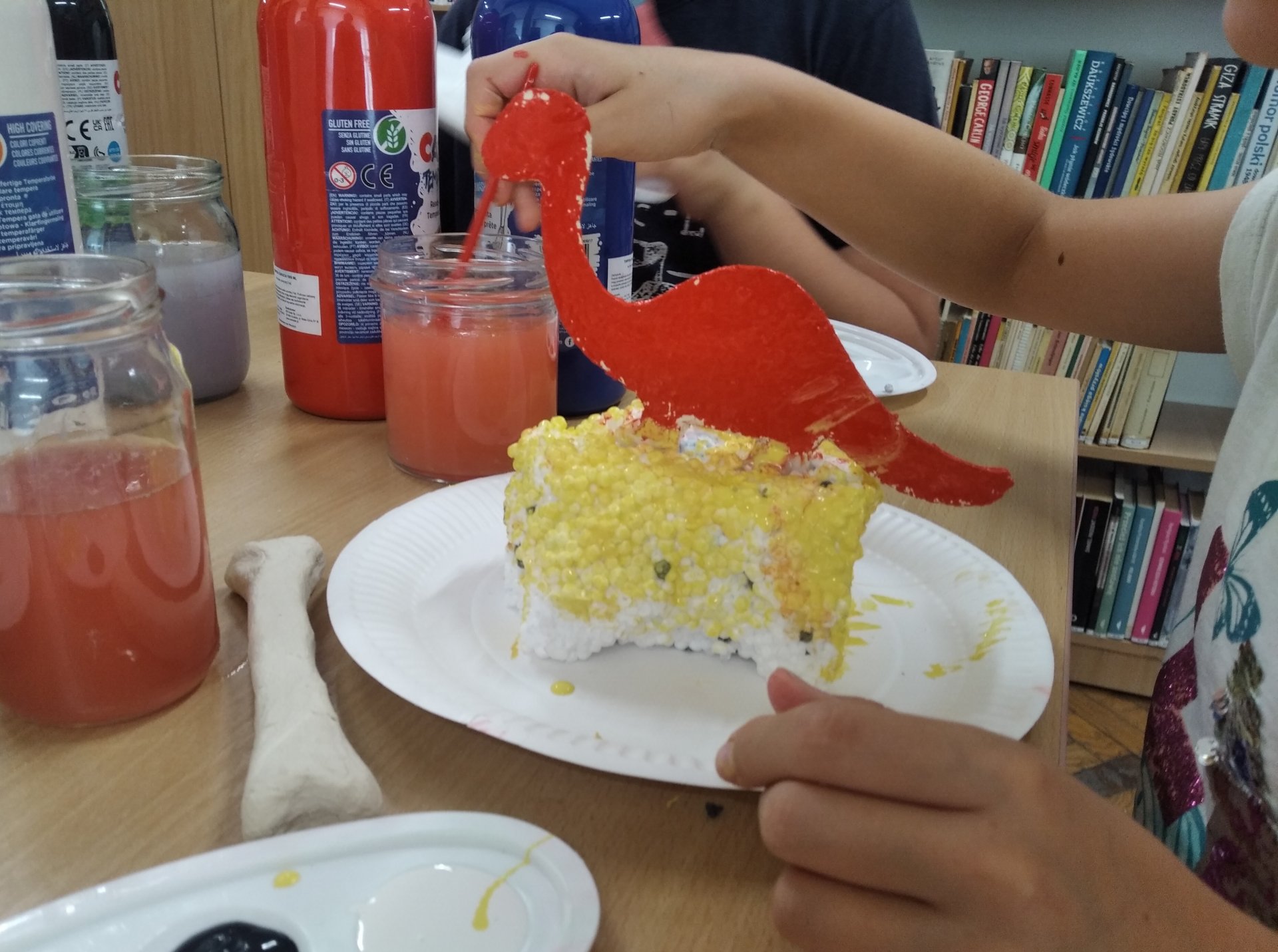 Uczestnicy zajęć pracowali dziś nad dinozaurem z masy papierowej, który umocowany na kawałku styropianu będzie pamiątką po wakacyjnym spotkaniu w bibliotece.