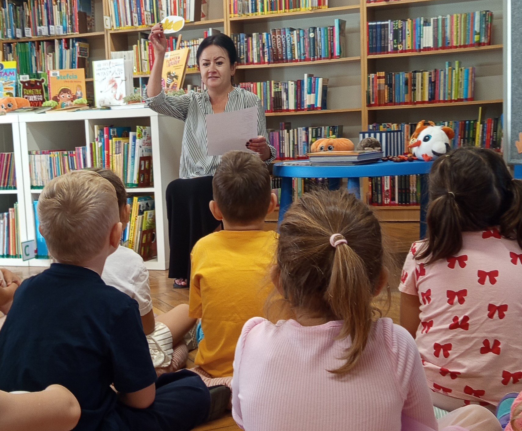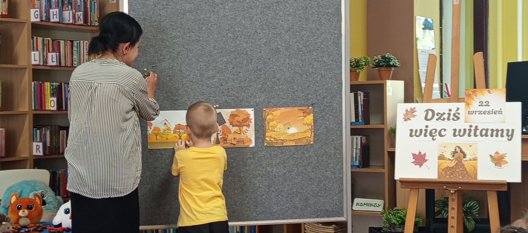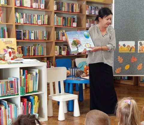Aby w towarzystwie książek powitać wspaniałą porę roku, która właśnie się rozpoczyna, grupa Sówek z będzińskiego Przedszkola Miejskiego nr 6 odwiedziła filię nr 1 Ksawera. Spotkanie rozpoczęliśmy wierszem Doroty Gellner pt. "Jesienny pociąg". Dzięki przygotowanym do utworu ilustracjom dzieci uczestniczyły we wspólnej recytacji. Na kolorowy spacer zaprosiła wszystkich Małgorzata Strzałkowska za sprawą książki pt. "Jesień". Wspomina w niej o sezonowych owocach, odlatujących na zimę ptakach, jarzębinie i grzybach.