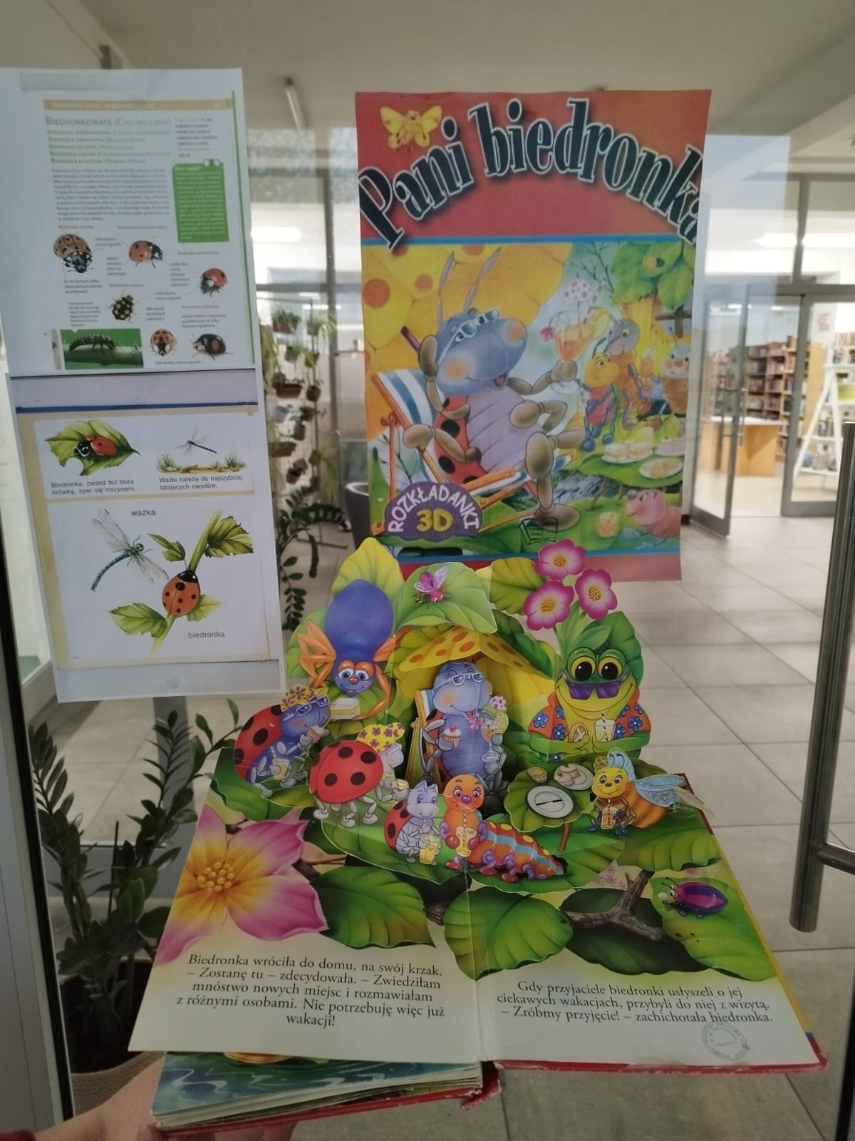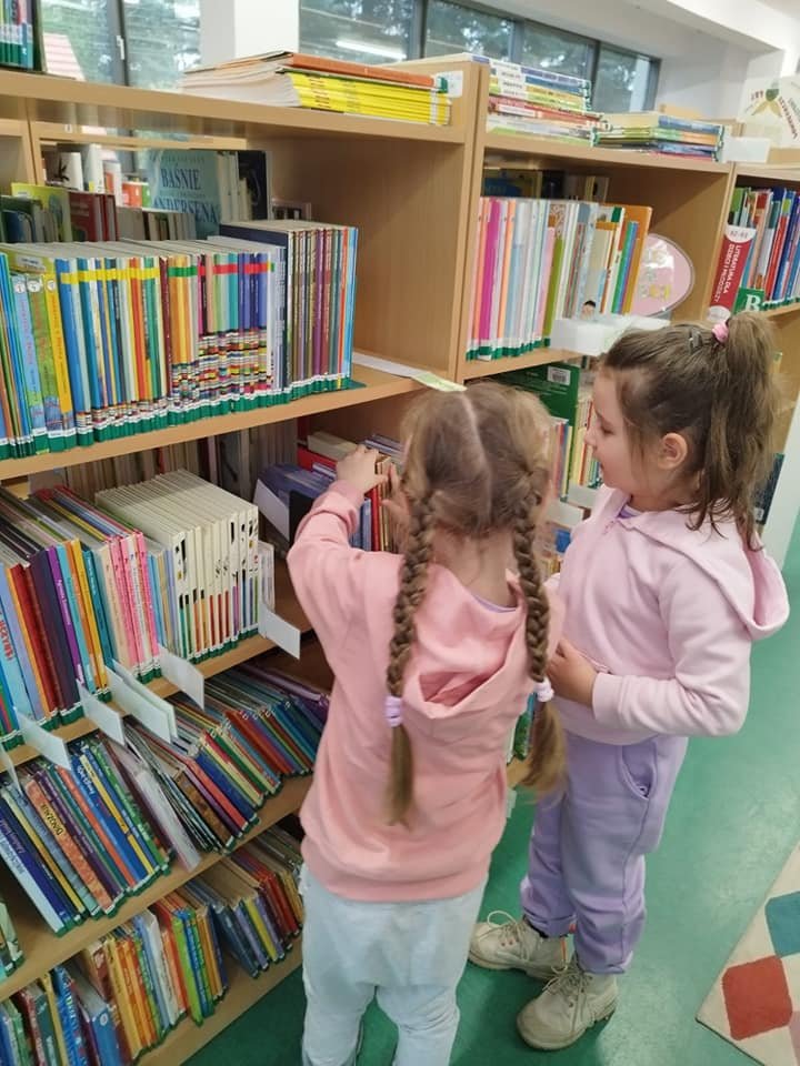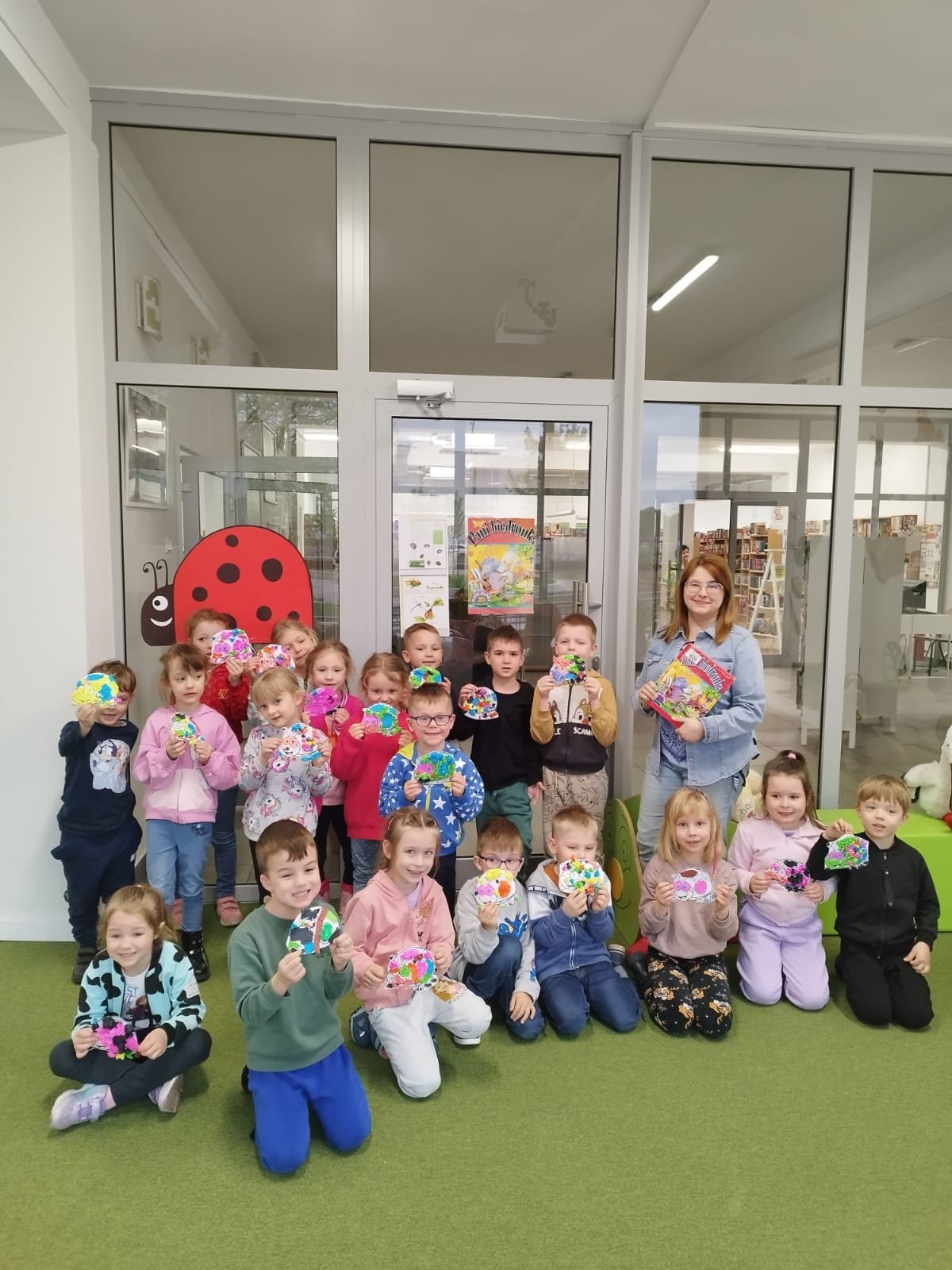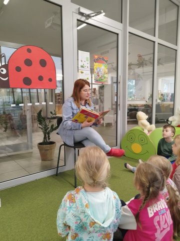 Była to pierwsza wizyta grupy Żabek w bibliotece, w trakcie której pięciolatki zapoznały się z zasadami korzystania ze zbiorów, oglądały książki i dowiedziały się, gdzie mogą szukać swoich ulubionych bajek. Dzieci wybrały książkę pt.” Pani biedronka”, wysłuchały opowiesci o biedronce i jej ciekawych wakacjach. Zabawna historia, która zawiera piękne, rozkładane ilustracje. Grupa dowiedziała się także, że biedronki należą do rodziny z rzędu chrząszczy, która liczy ponad 6 tysięcy gatunków owadów o czerwonych lub pomarańczowych pokrywach skrzydeł z czarnymi kropkami. Szczególnym gatunkiem występującym także w Polsce jest biedronka siedmiokropka nazywana często bożą krówką.