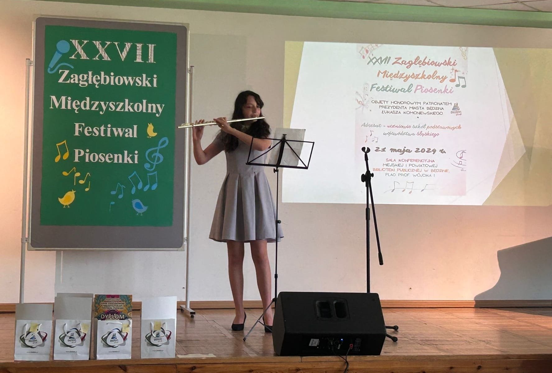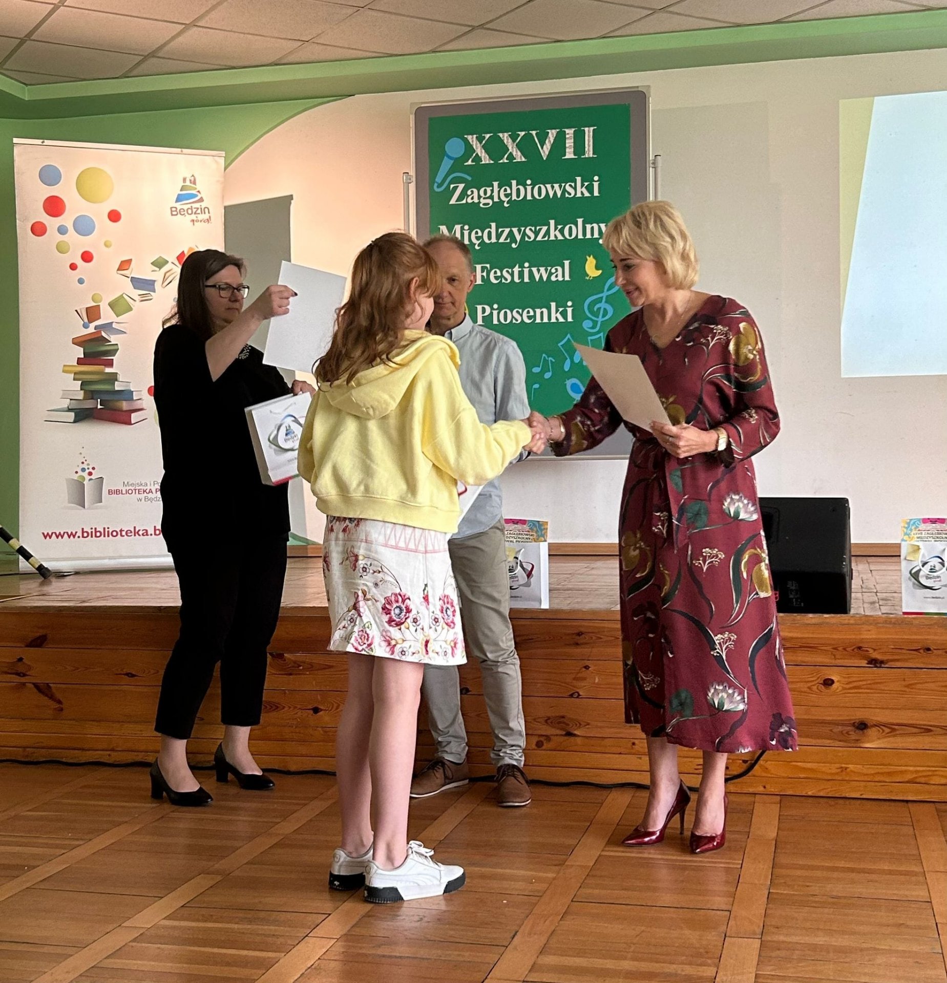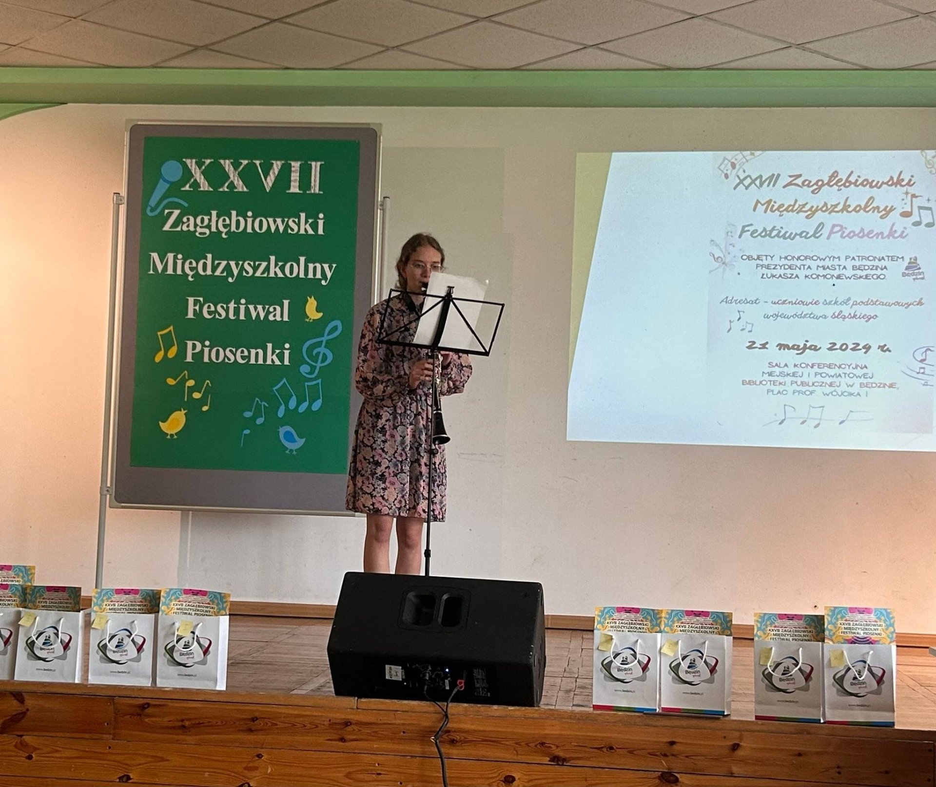 Cieszymy się, że co roku możemy stawać się najbardziej rozśpiewaną biblioteką, nie tylko w Zagłębiu ale i całym województwie. Festiwal od lat jest bliski sercu będzińskiej książnicy. „Merytoryczną cegiełką” jest reprezentacja biblioteki w festiwalowym Jury, w którym od lat zasiada przedstawiciel bibliotekarzy Pan Michał Fiuk – Kierownik Działu Promocji i Informacji MiPBP w Będzinie. Muzyczną niespodzianką dla wszystkich uczestników był występ uczennic ze Szkoły Podstawowej nr 1 im. A. Mickiewicza w Będzinie: Katarzyny Wiktorowicz (flet) oraz Zuzanny Bąk (klarnet).
