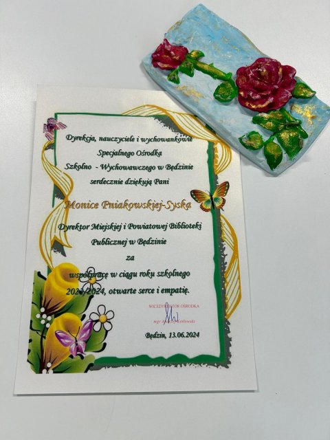 Na ręce Pani Dyrektor Moniki Pniakowskiej -Syski wpłynęło podziękowanie od Dyrekcji, Nauczycieli i Wychowawców Specjalnego Ośrodka Szkolno - Wychowawczego w Będzinie za całoroczną współpracę będzińskich bibliotekarzy podczas licznie organizowanych zajęć podopiecznych SOSW Będzin .