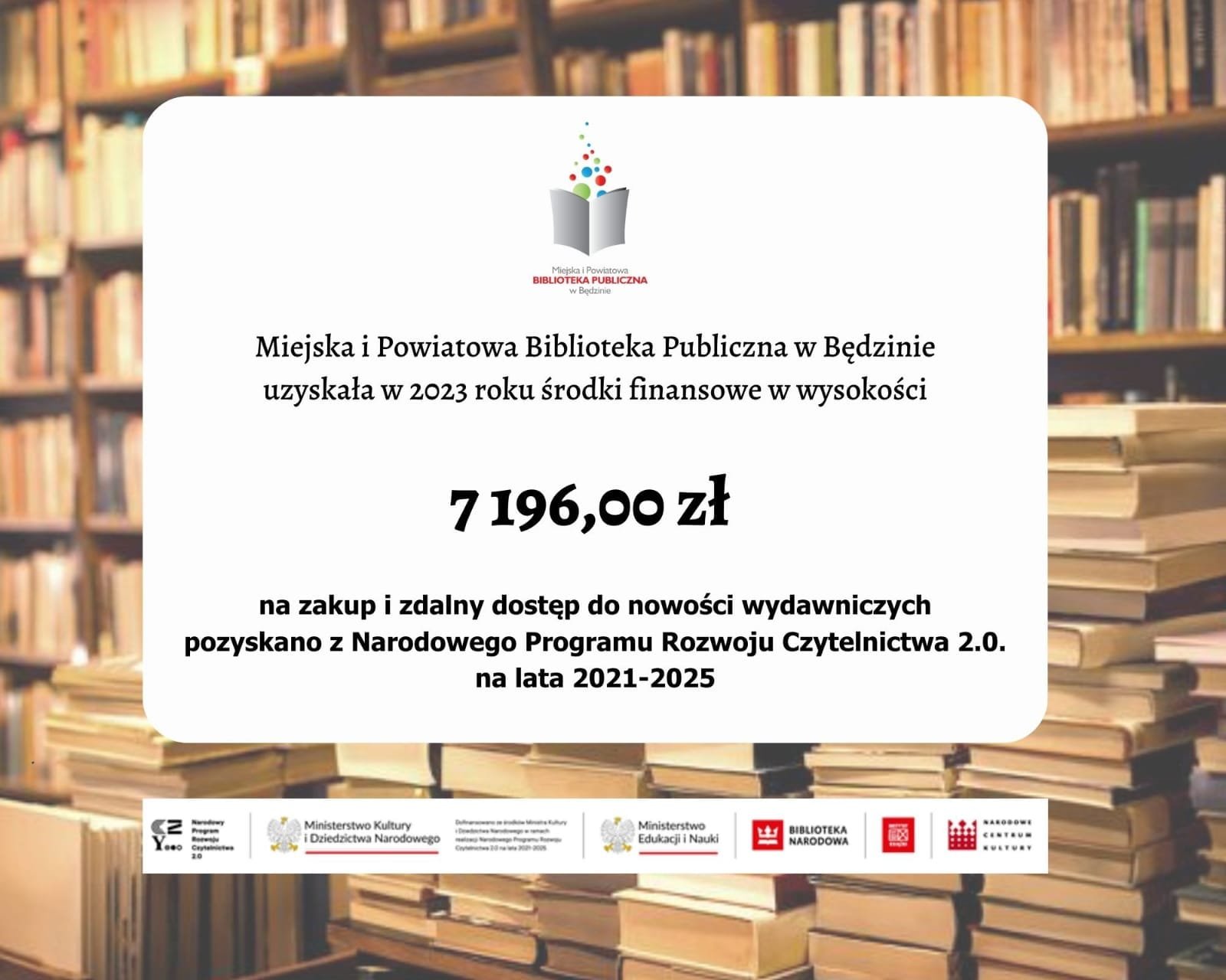 Kwota dofinansowania jaką pozyskała będzińska biblioteka w 2023 r. to 7 196,00 zł.
