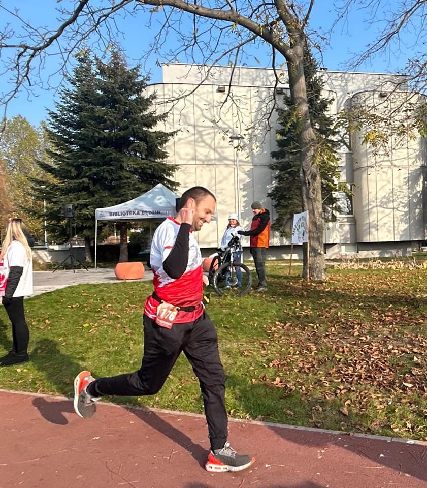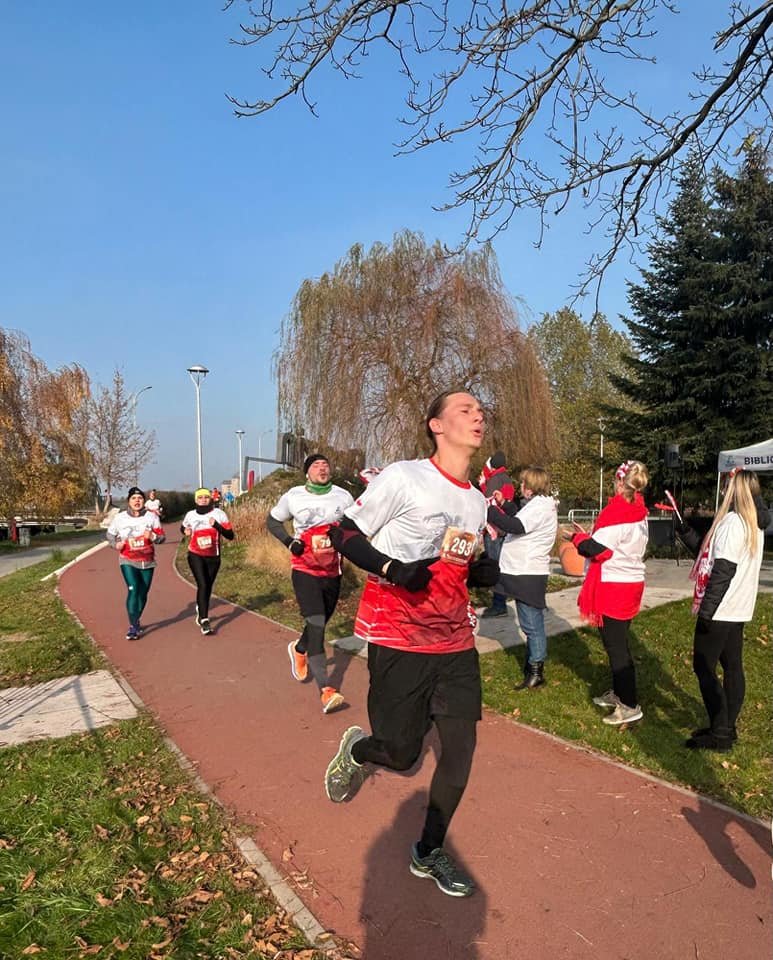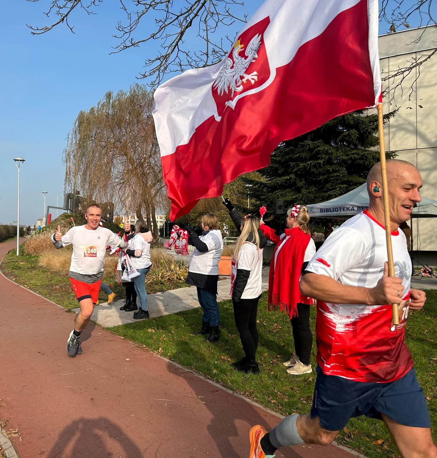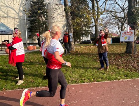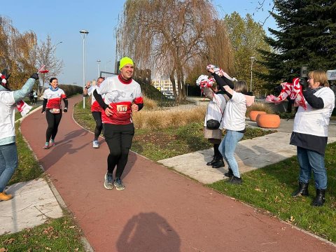 Już po raz drugi gorący doping prosto z będzińskiej ksiażnicy witał wszystkich uczestników będzińskiego II Półmaratonu Niepodległości