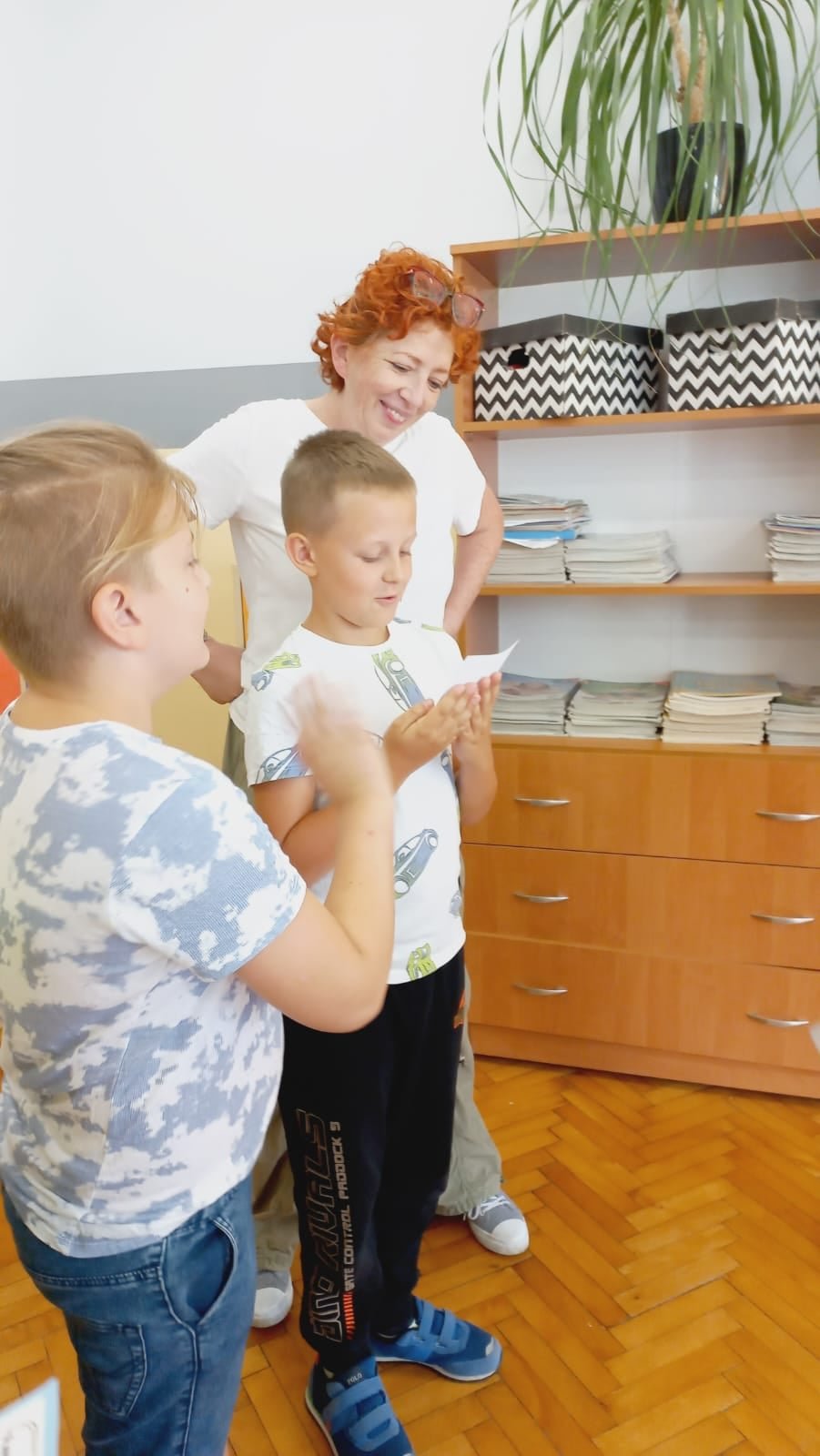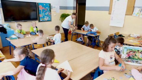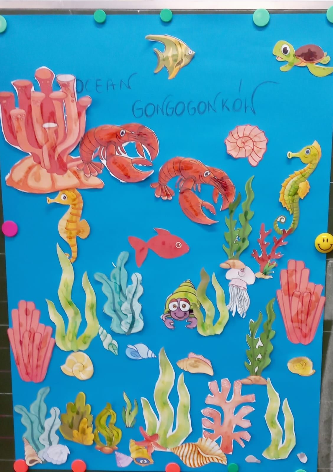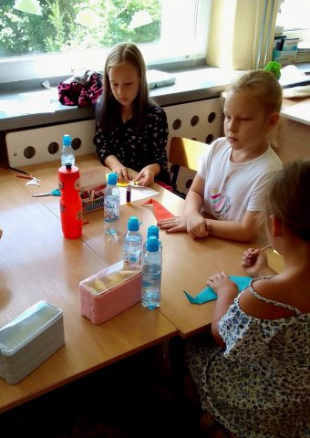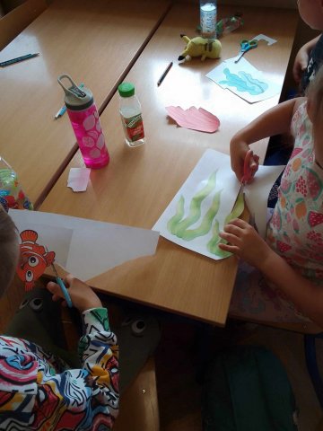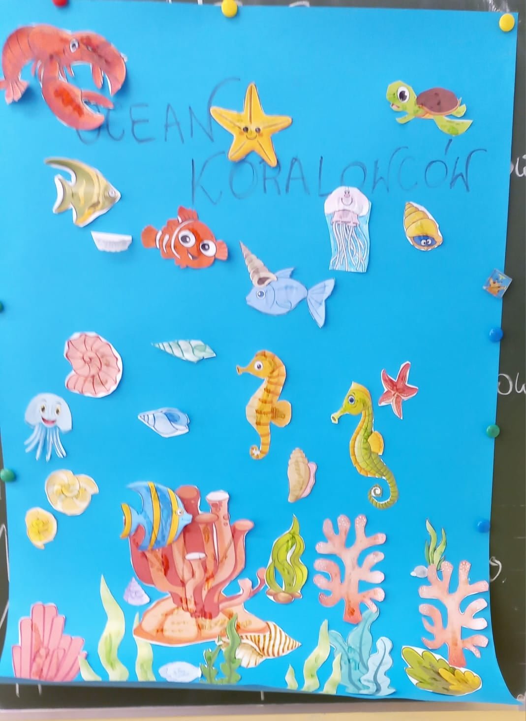Dlaczego Ziemię nazywamy Niebieską planetą? - ponieważ z kosmosu widoczne są w większości morza i oceany. Ponad 70% powierzchni kuli ziemskiej pokrywa woda. Jak ważna jest woda dla nas mieszkańców? Dlaczego musimy dbać o oceany i ich nie zaśmiecać. Okazuje się, że dzieci świetnie orientują się w cyklu obiegu wody w przyrodzie. Podczas zajęć wykonaliśmy wspólną planszę, która przedstawia głębie oceanu widzianą oczami naszych młodych uczestników miejskich półkolonii. Podczas spotkania towarzyszył nam także wiersz Juliana Tuwima "Pan Maluśkiewicz i wieloryb." Dzieci na zakończenie zajęć wykonały metodą origami wieloryba i jacht.