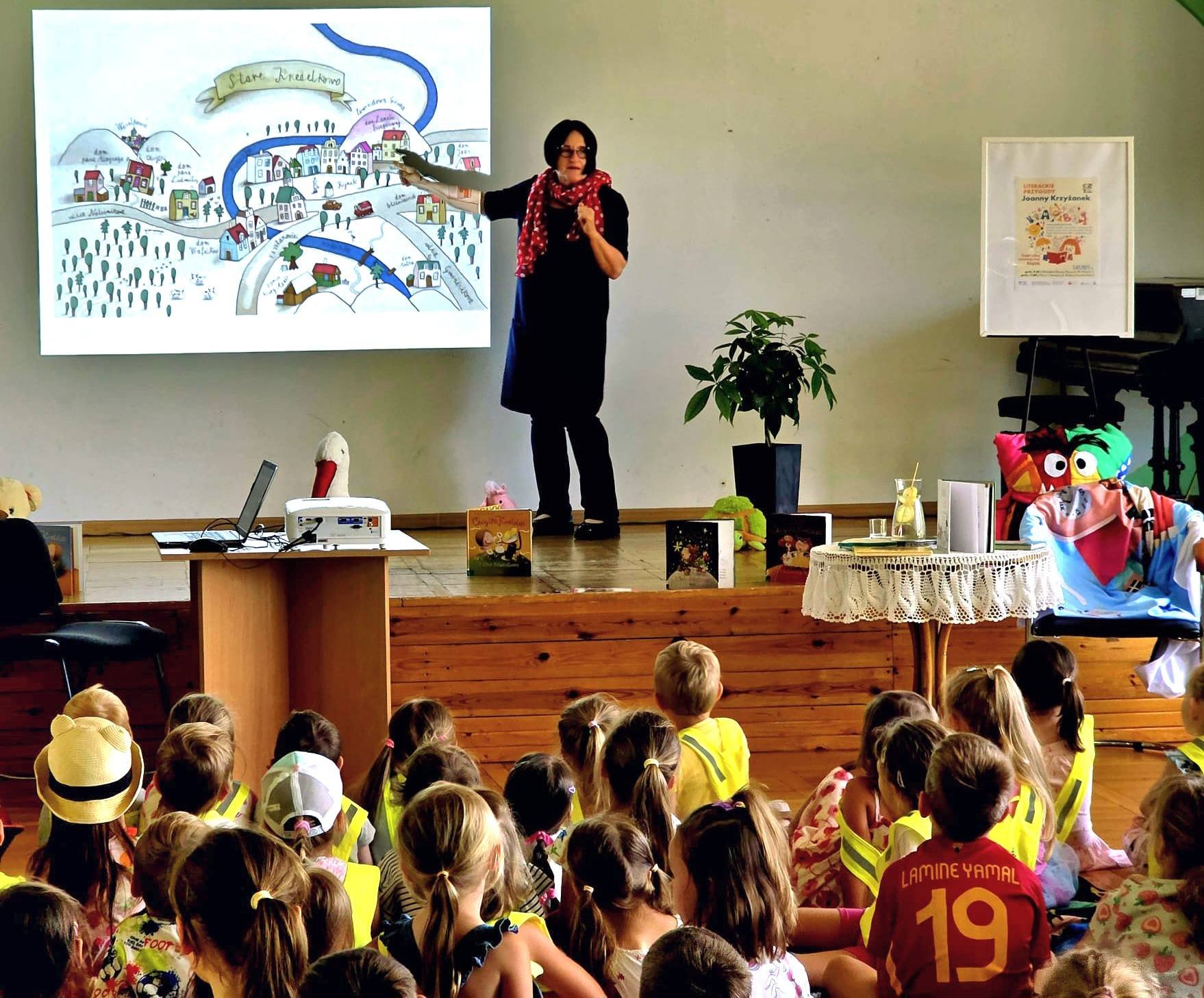 Pisarka zaprosiła uczestników spotkania w niezwykłą podróż z bohaterami jej książek - Cecylką Knedelek, Gąską Walerką i Kurą Aurelią. Przybyłym licznie przedszkolakom przypadł do gustu również Kot Papla oraz dyskusja na temat ich ulubionych zwierząt. Dzieci z zaciekawieniem słuchały opowieści o magicznych literkach, które układają się w słowa, a potem w literackie przygody oraz o gałgankowych lalkach, których Joanna Krzyżanek jest wielką miłośniczką. Chętnie zadawały też pytania, bo bardzo ciekawiło ich dzieciństwo gościa oraz co sprawiło, że została pisarką.