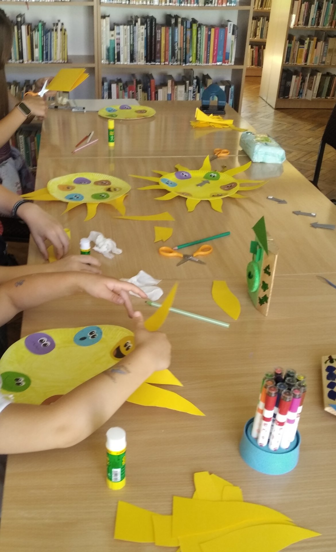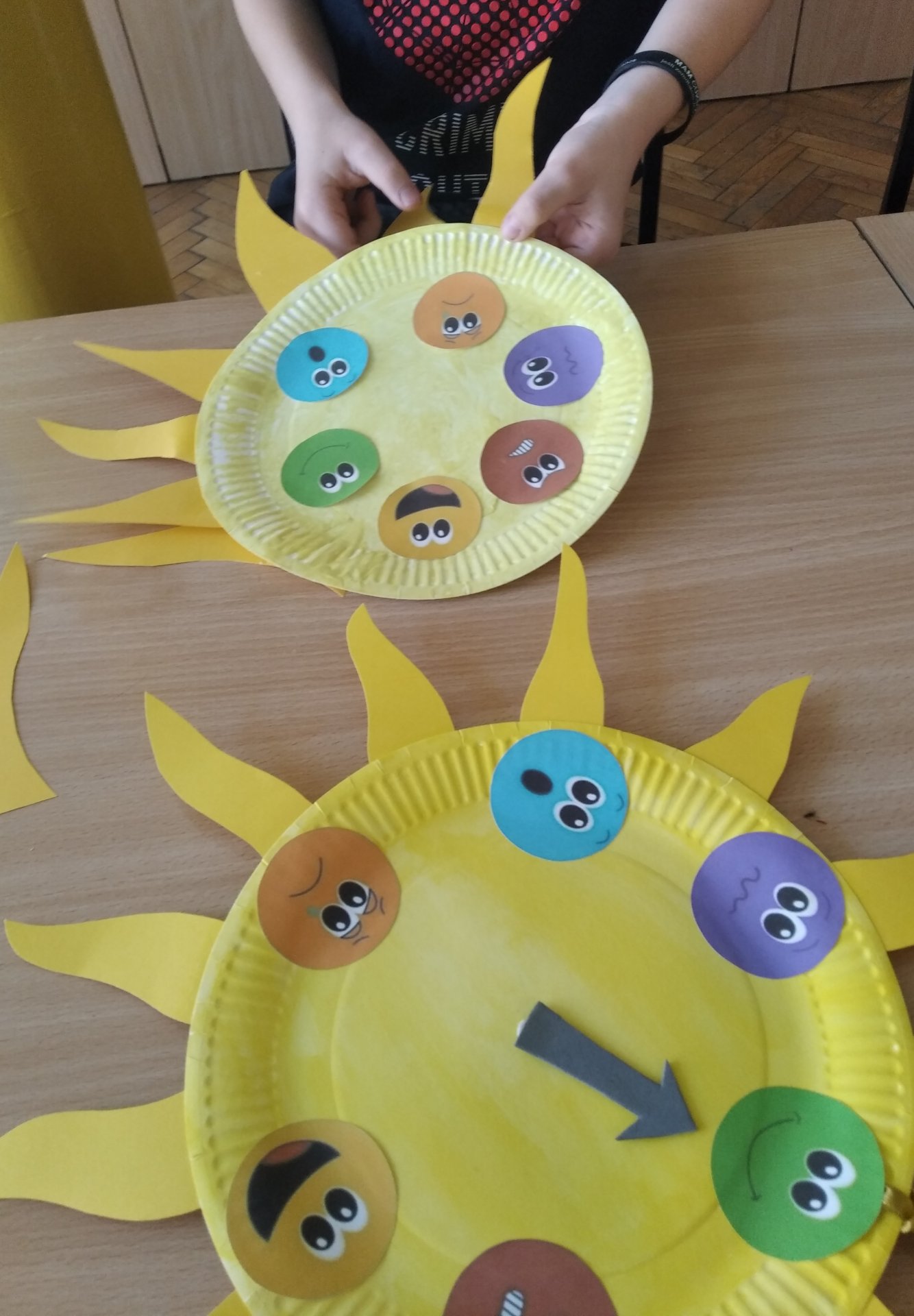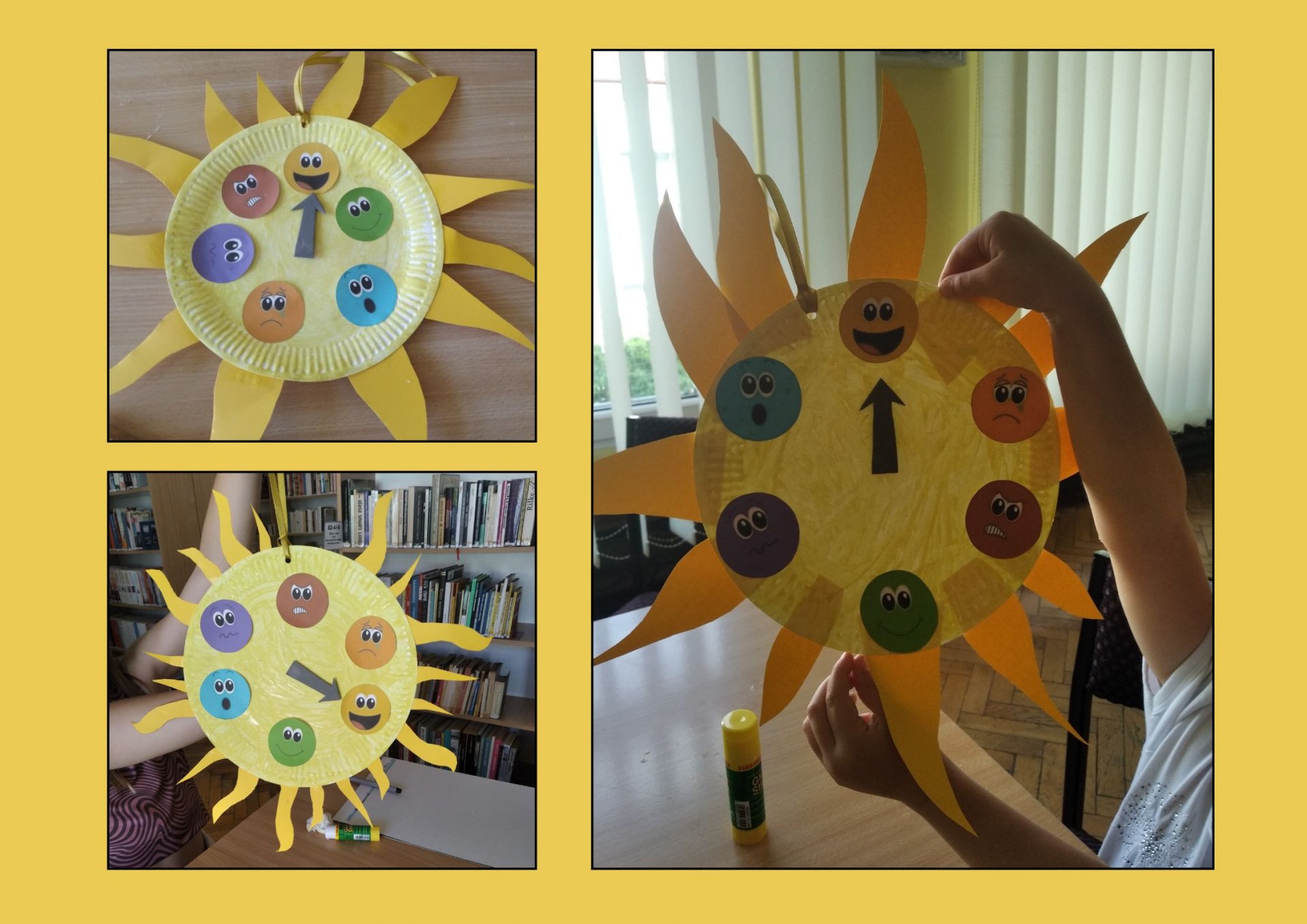 w jakim są w danym momencie nastroju. Mowa o tzw. "zegarze emocji". Na tarczy zamiast godzin umieściliśmy między innymi uśmiechnięte, smutne i przestraszone buźki. Teraz będzie można ustawić wskazówkę na odpowiednią emocję. Oby zawsze była to radość i szczęście! Wszystkim uczestnikom naszych zajęć i opiekunom, którzy przychodzą z dziećmi do biblioteki życzymy wspaniałych wakacji. Na kolejne spotkanie z "Fantazją" zapraszamy we wrześniu.