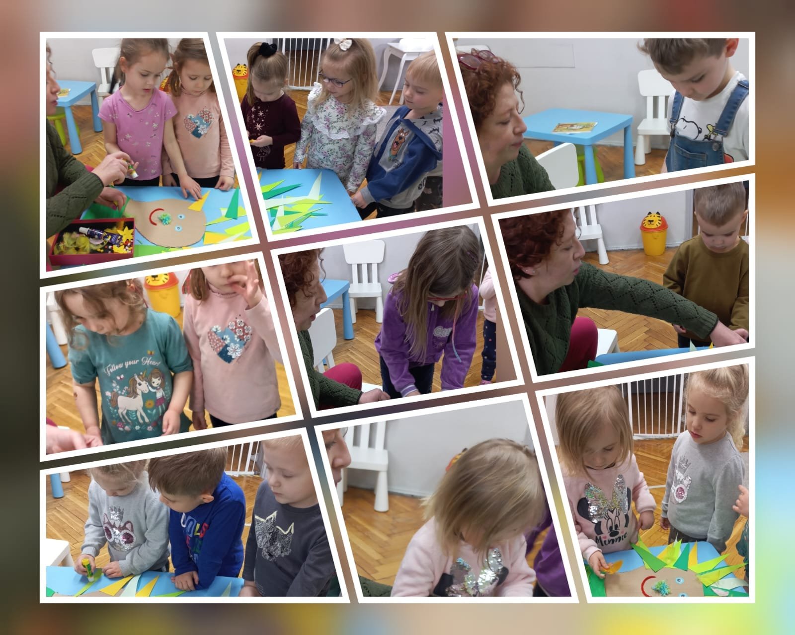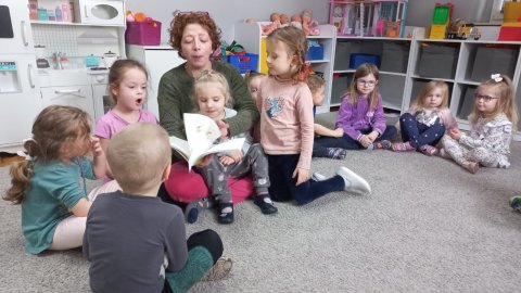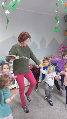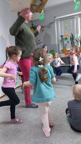 W czasie kolejnych bibliotecznych odwiedzin, czytając wiersz, udawaliśmy bociany. Przedszkolny rekord - utrzymania się na jednej nodze - to 20 sekund. Razem śpiewaliśmy jak skowronki z wierszyka, brdziliśmy w wodzie jak żurawie oraz przydotowaliśmy grzaądki do sadzenia warzyw.