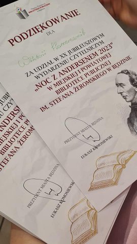Na zakończenie wydarzenia każdy uczestnik otrzymał pamiątkowy dyplom podpisany przez Prezydenta Miasta w Będzinie. Nad bezpieczeństwem dzieci czuwali bibliotekarze i Strażnicy Straży Miejskiej, którzy eskortowali nas podczas nocnych wędrówek.
