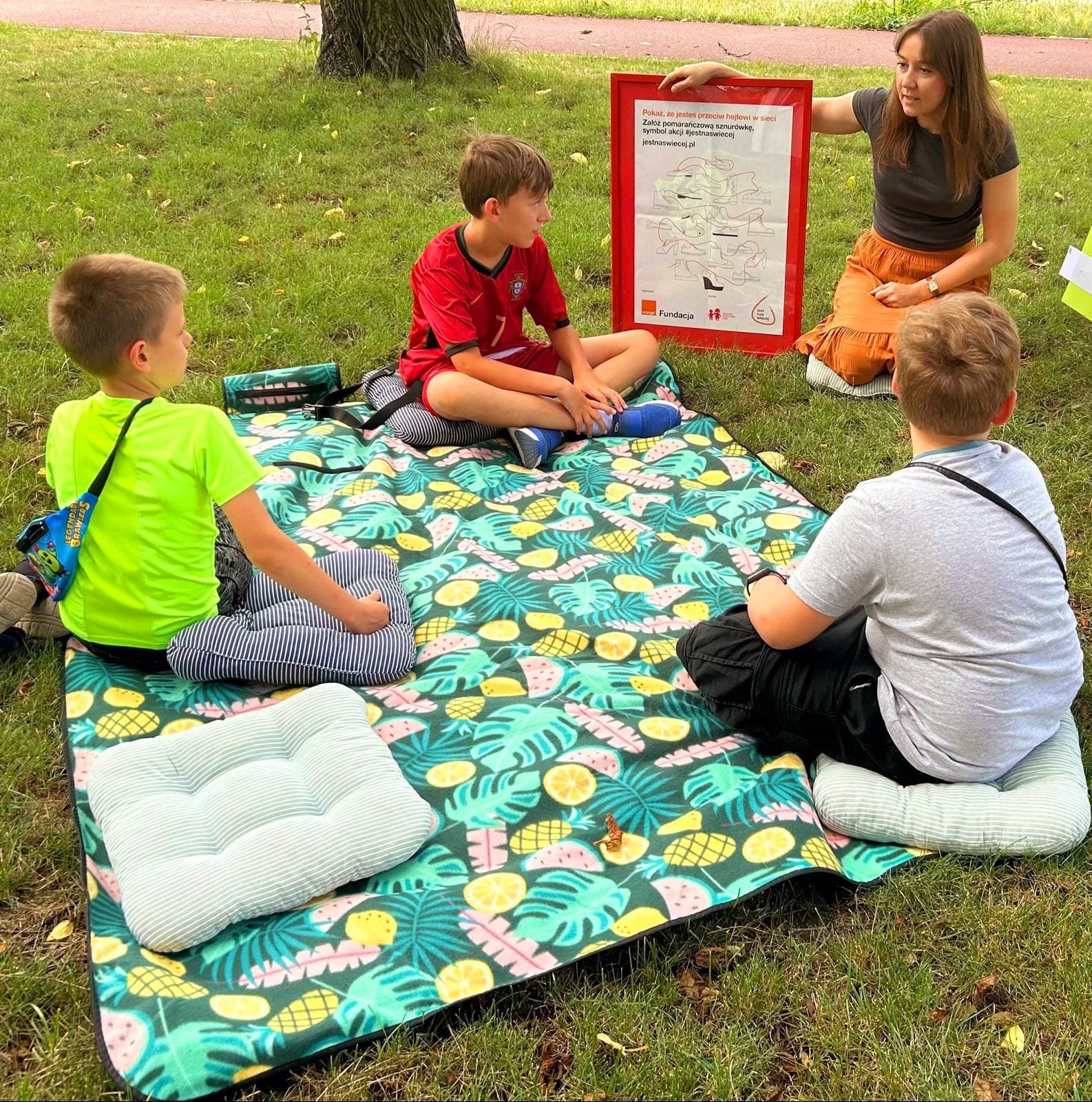 Wakacje to dobry czas by spędzać czas na dworze. Jednak w dzisiejszych czasach wiele dzieci oraz nastolatków wybiera komputer lub telefon. Spędzając czas w Internecie są narażeni na wiele niebezpieczeństw, które w największej mierze pochodzą od innych użytkowników. Hejt oraz potrzeba zyskiwania lajków stały się tematem naszego spotkania. Dzięki materiałom otrzymanym od Fundacji Dajemy Dzieciom Siłę w ramach projektu Sieciaki.pl rozmawianie o tym jak sobie z nim radzić, jak go nie napędzać oraz jak mu się sprzeciwiać stało się dużo łatwiejsze. Uczestnicy otrzymali również pomarańczowe sznurówki, które są symbolem akcji przeciwko hejtowi #jestnaswiecej.