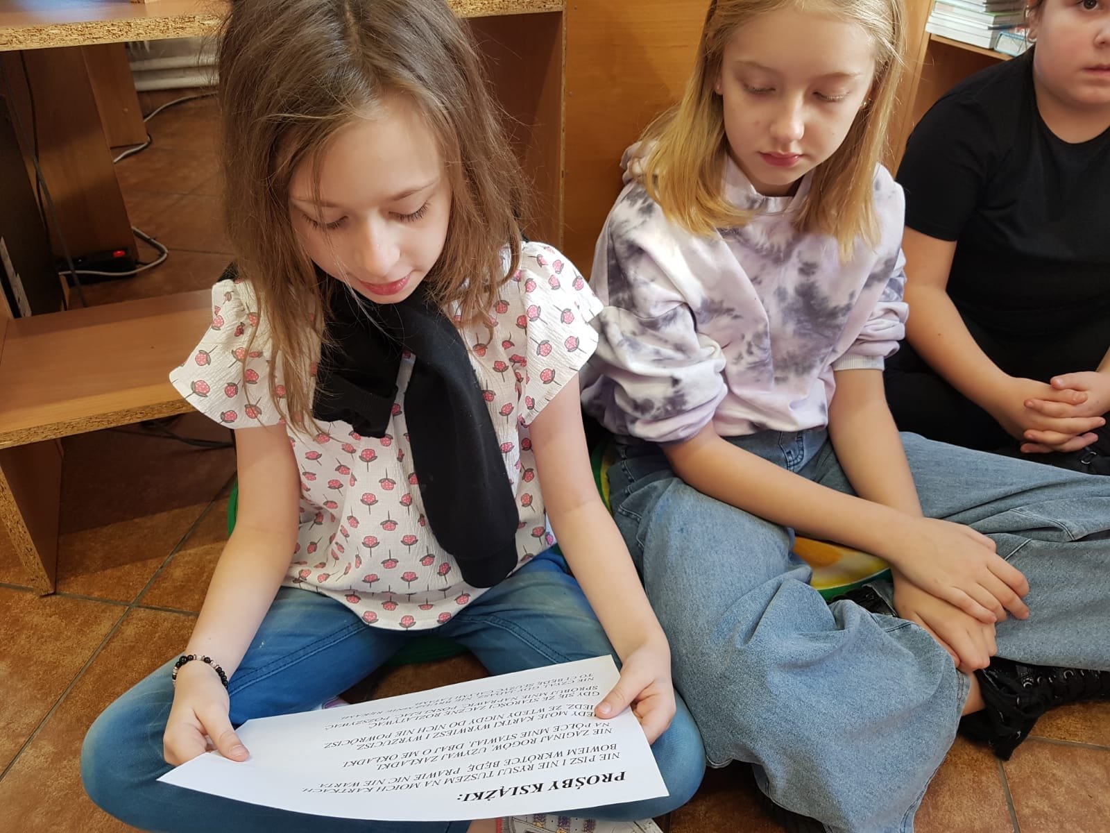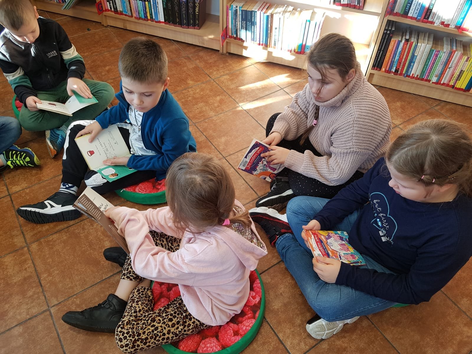 Podczas wizyty dzieci opowiedziały o swoich zainteresowaniach czytelniczych i ulubionych książkach oraz ich bohaterach. Spotkanie w bibliotece nie mogło się odbyć bez głośnego czytania. Tym razem to nie bibliotekarka czytała lecz same dzieci. Największym zainteresowaniem cieszyły się książki z serii „Czytam sobie”. Na zakończenie dzieci rozwiązywały krzyżówkę, a do szkoły zabrały zakładkę, którą ozdobią według własnego uznania.