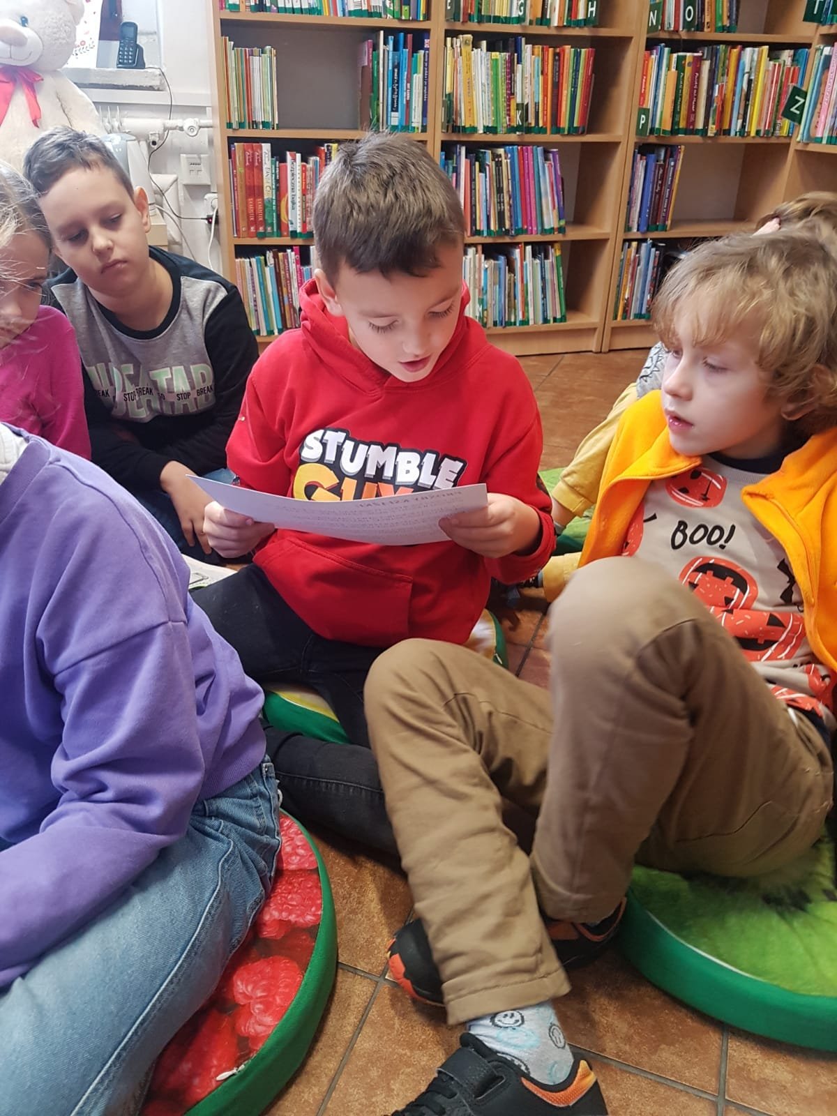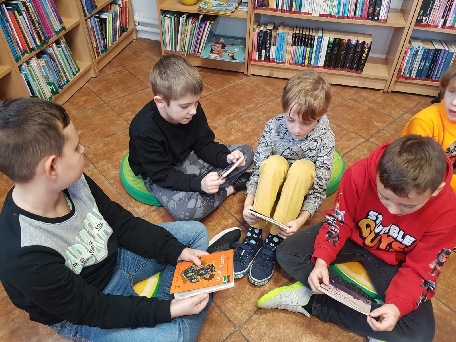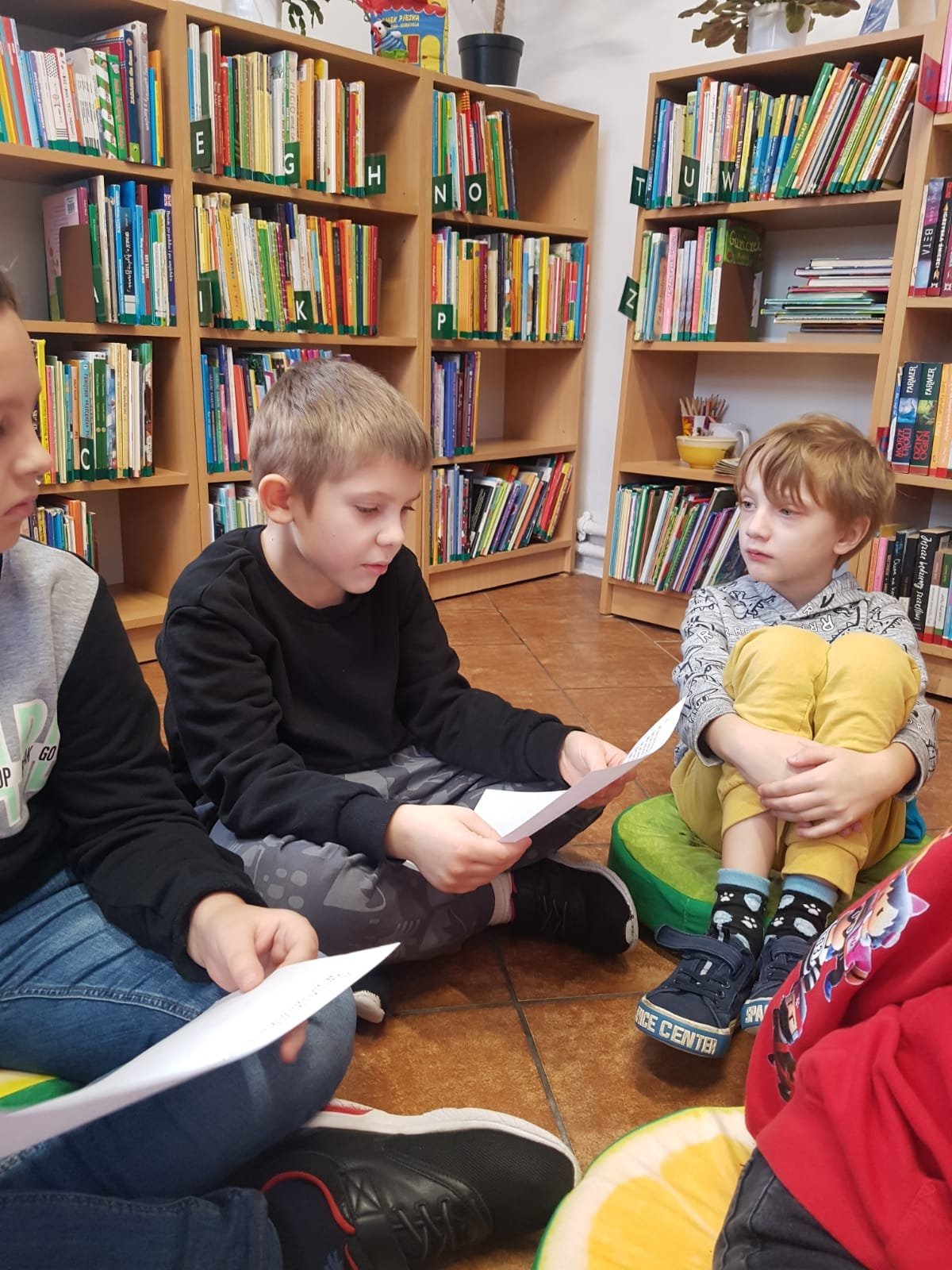Po wspólnym przeczytaniu wiersza „Troski książki” drugoklasiści rozmawiali na temat, jak właściwie traktować i szanować zbiory biblioteczne. Spotkanie w bibliotece nie mogło się odbyć bez głośnego czytania. Dzieci same bardzo chętnie czytały autorów i tytuły wybranych przez bibliotekarza książek dziecięcych, a nawet spróbowały wspólnie ułożyć je według alfabetu i umieścić na odpowiednim miejscu.