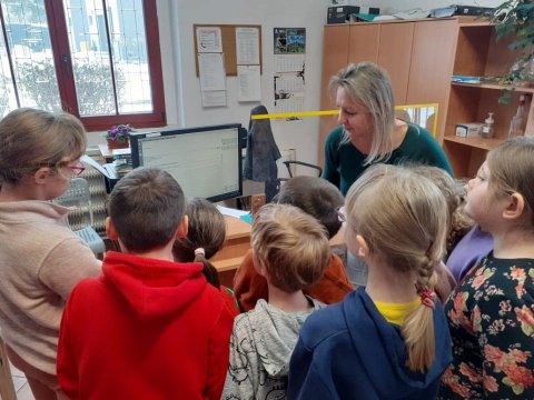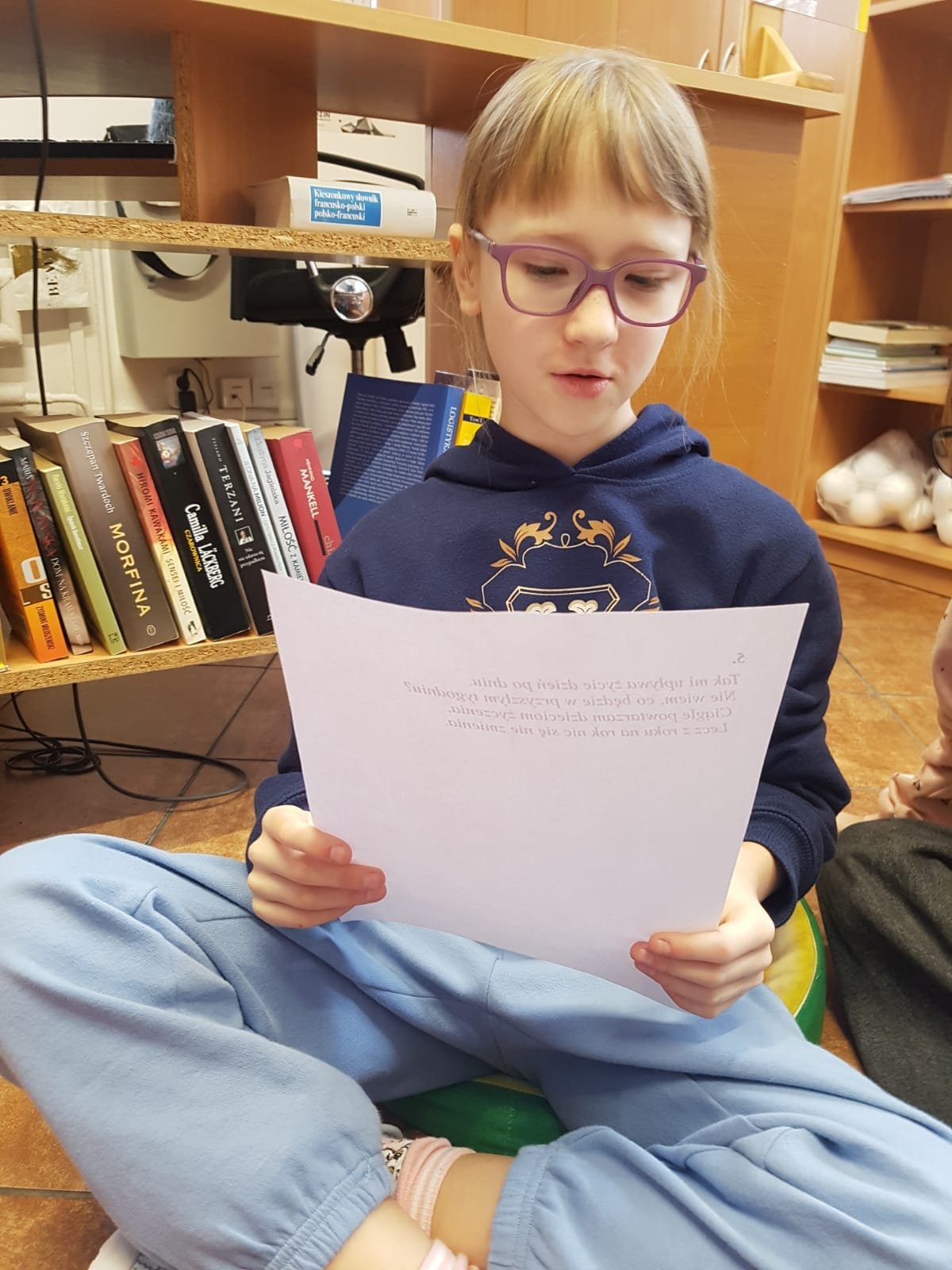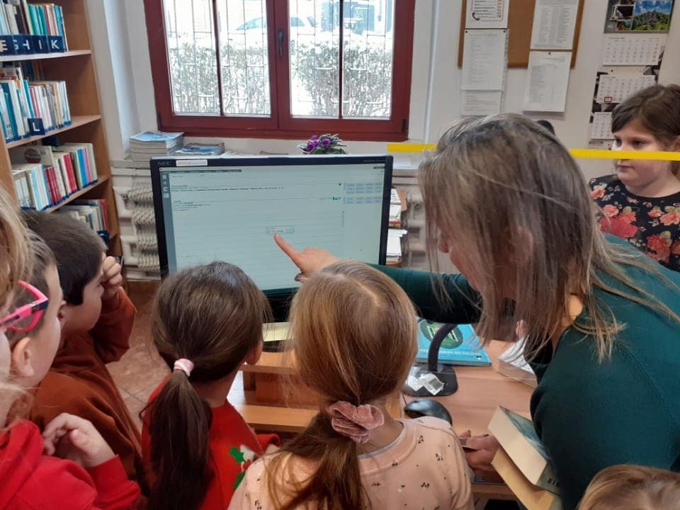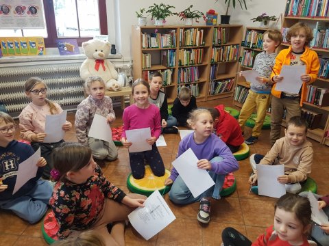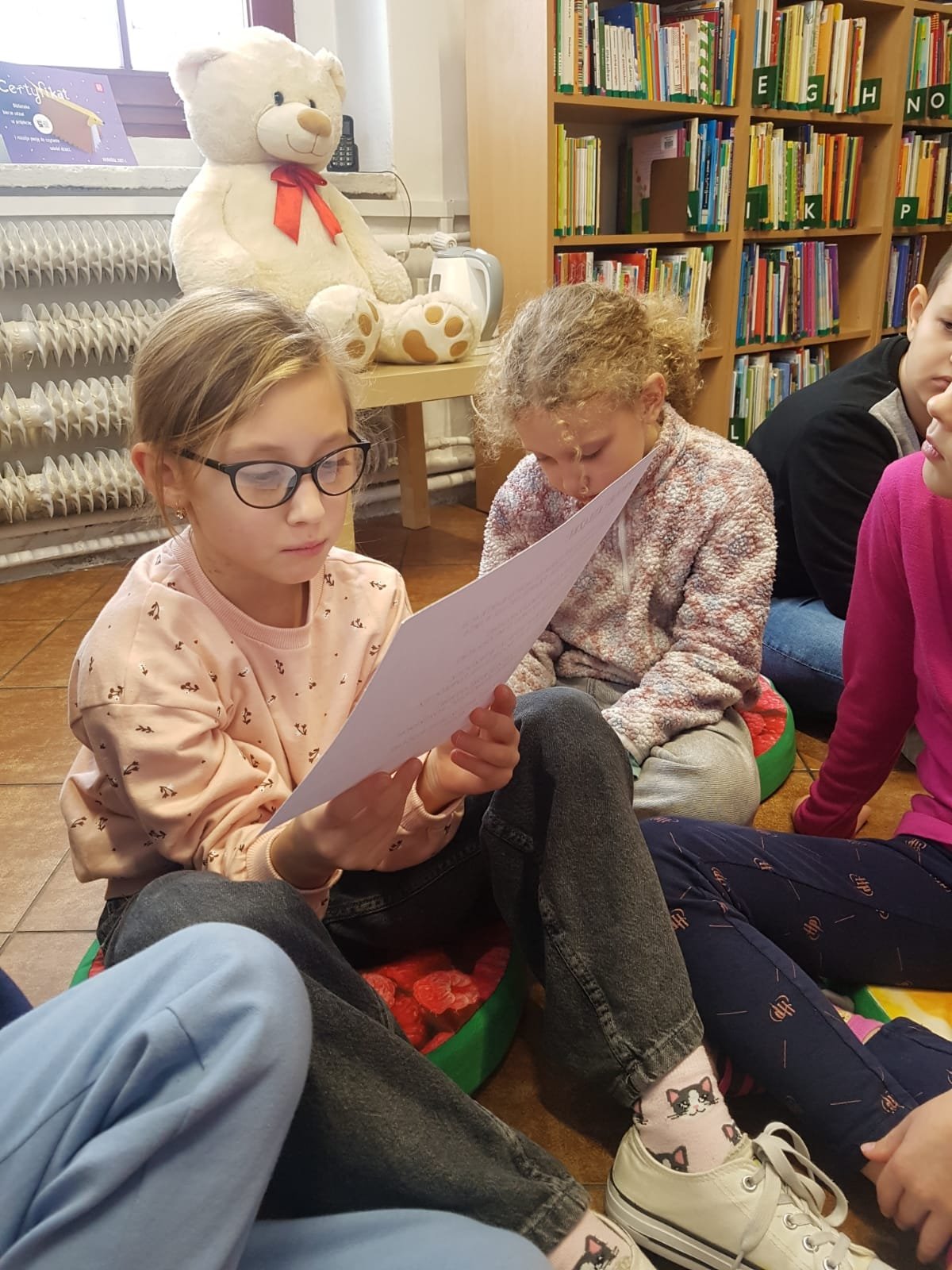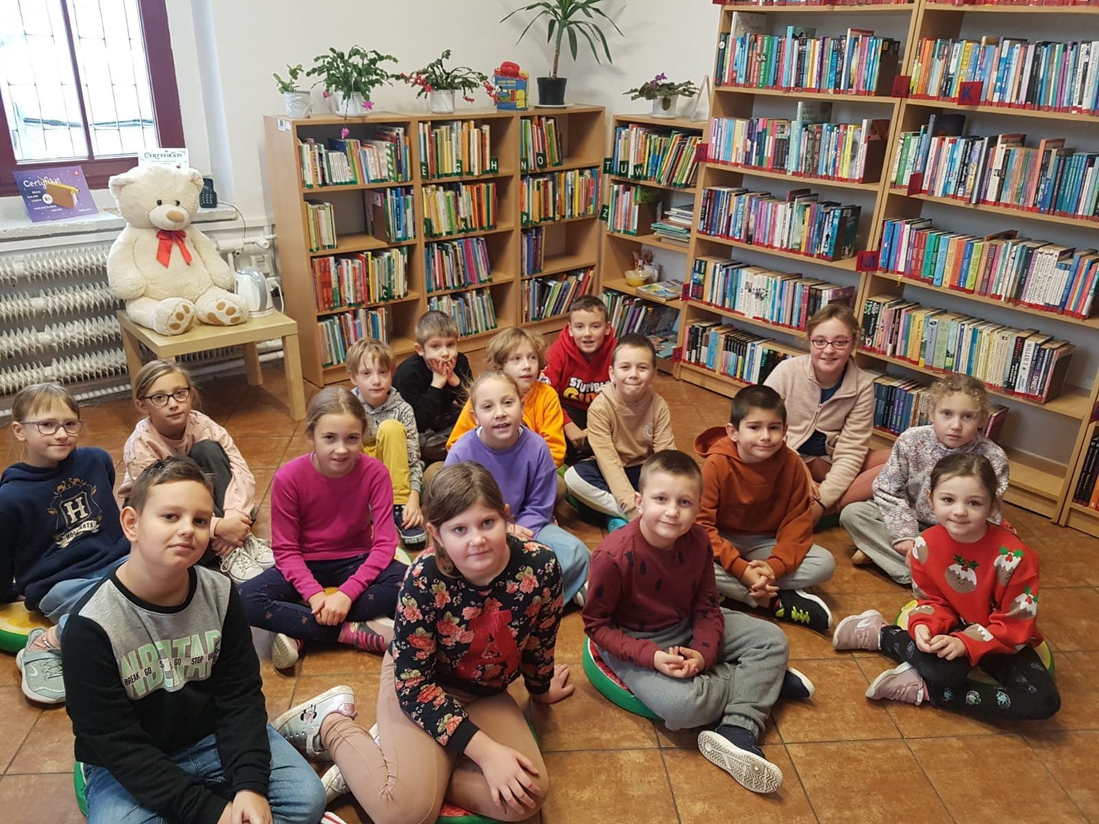 Po wspólnym przeczytaniu wiersza „Troski książki” drugoklasiści rozmawiali na temat, jak właściwie traktować i szanować zbiory biblioteczne. Spotkanie w bibliotece nie mogło się odbyć bez głośnego czytania. Dzieci same bardzo chętnie czytały autorów i tytuły wybranych przez bibliotekarza książek dziecięcych, a nawet spróbowały wspólnie ułożyć je według alfabetu i umieścić na odpowiednim miejscu.