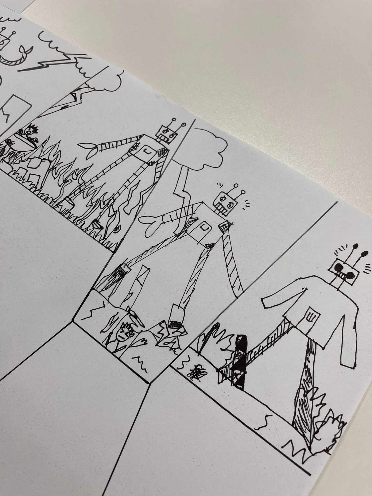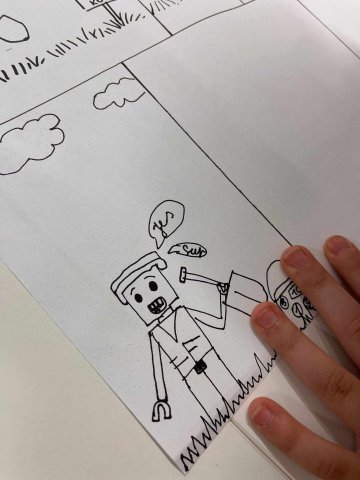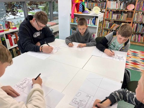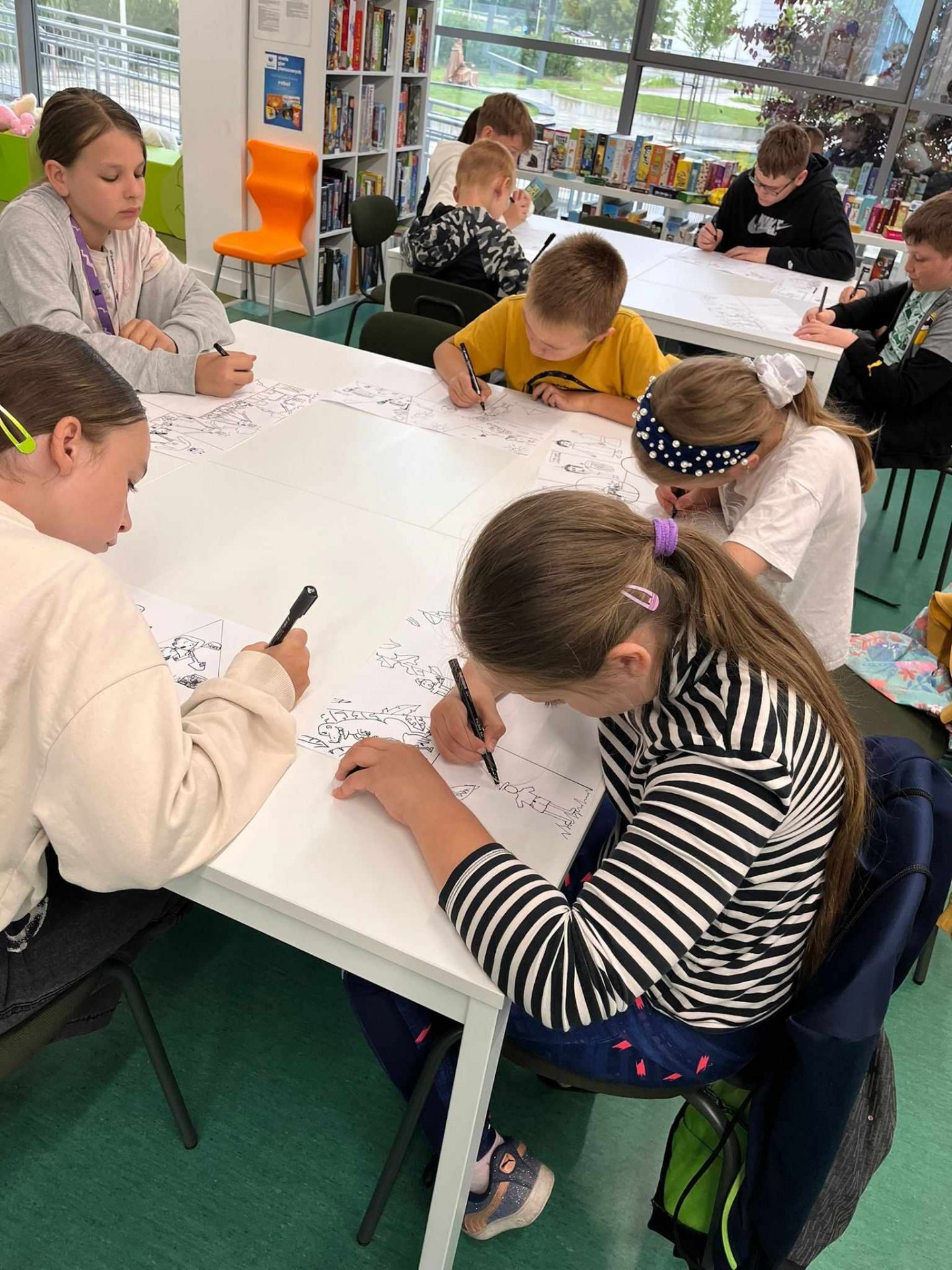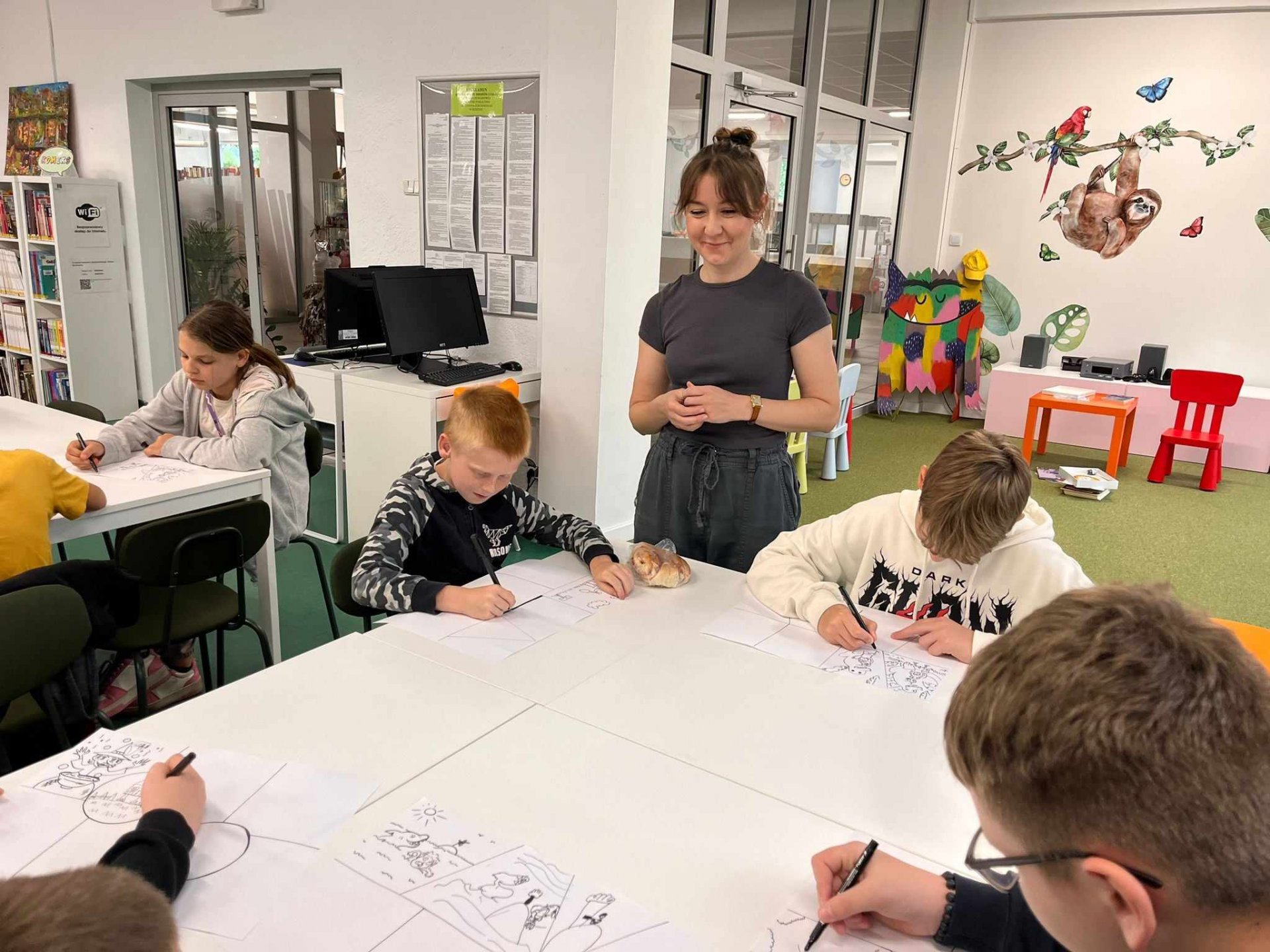 W ramach pracy plastycznej uczniowie wykonali wspólnie dziesięć komiksów, gdzie każdy z nich mógł stworzyć dalszy ciąg historii, a następnie podać komiks dalej.