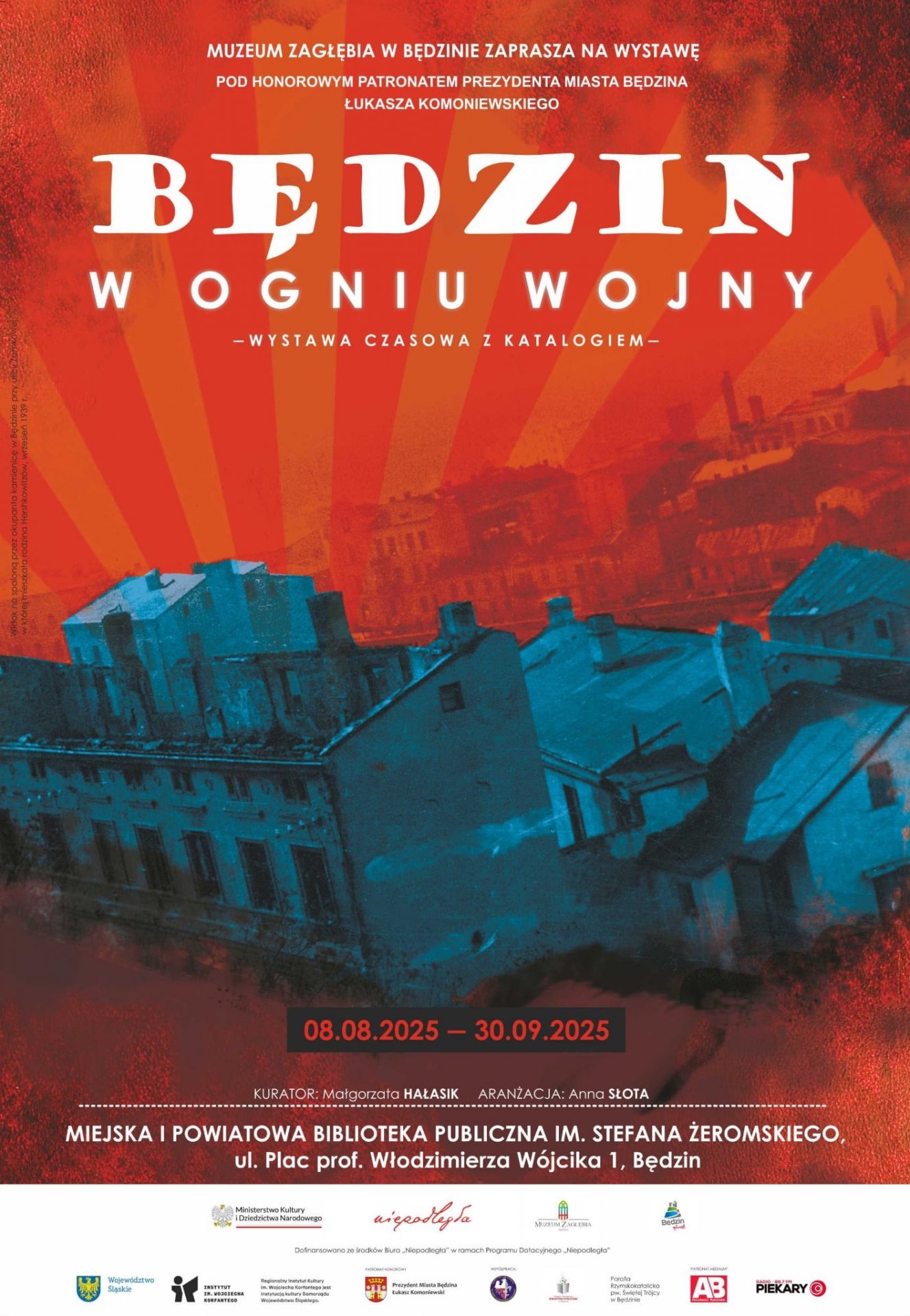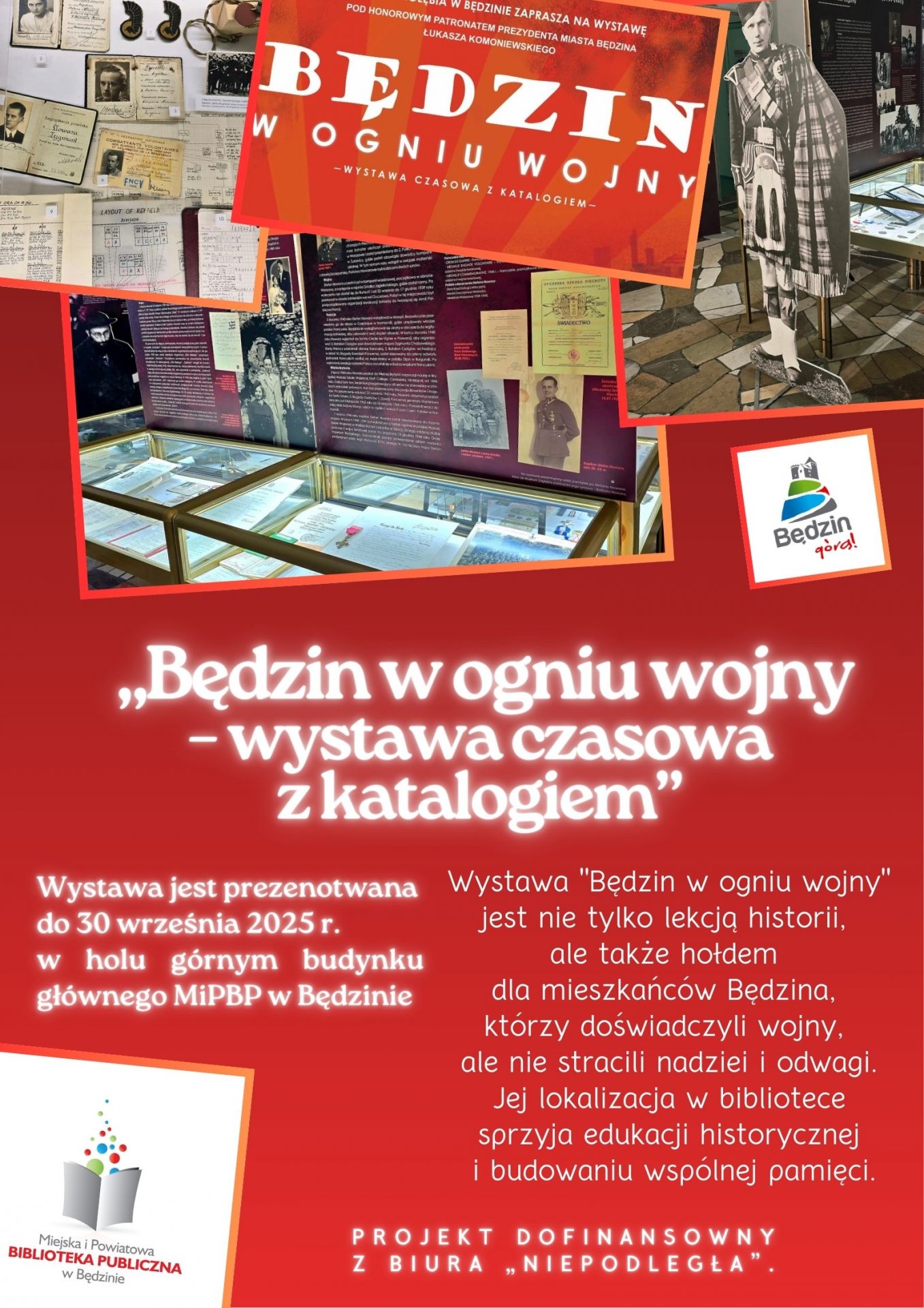 Ekspozycja „Będzin w ogniu wojny – wystawa czasowa z katalogiem” to wyjątkowa okazja do pogłębienia wiedzy na temat dramatycznych wydarzeń z okresu II wojny światowej. Wystawa przygotowana przez Muzeum Zagłębia w Będzinie została przeniesiona do Miejskiej i Powiatowej Biblioteki Publicznej im. Stefana Żeromskiego w Będzinie by zwiększyć jej dostępność dla mieszkańców miasta i gości, co pozwala na szersze upowszechnienie lokalnej historii.