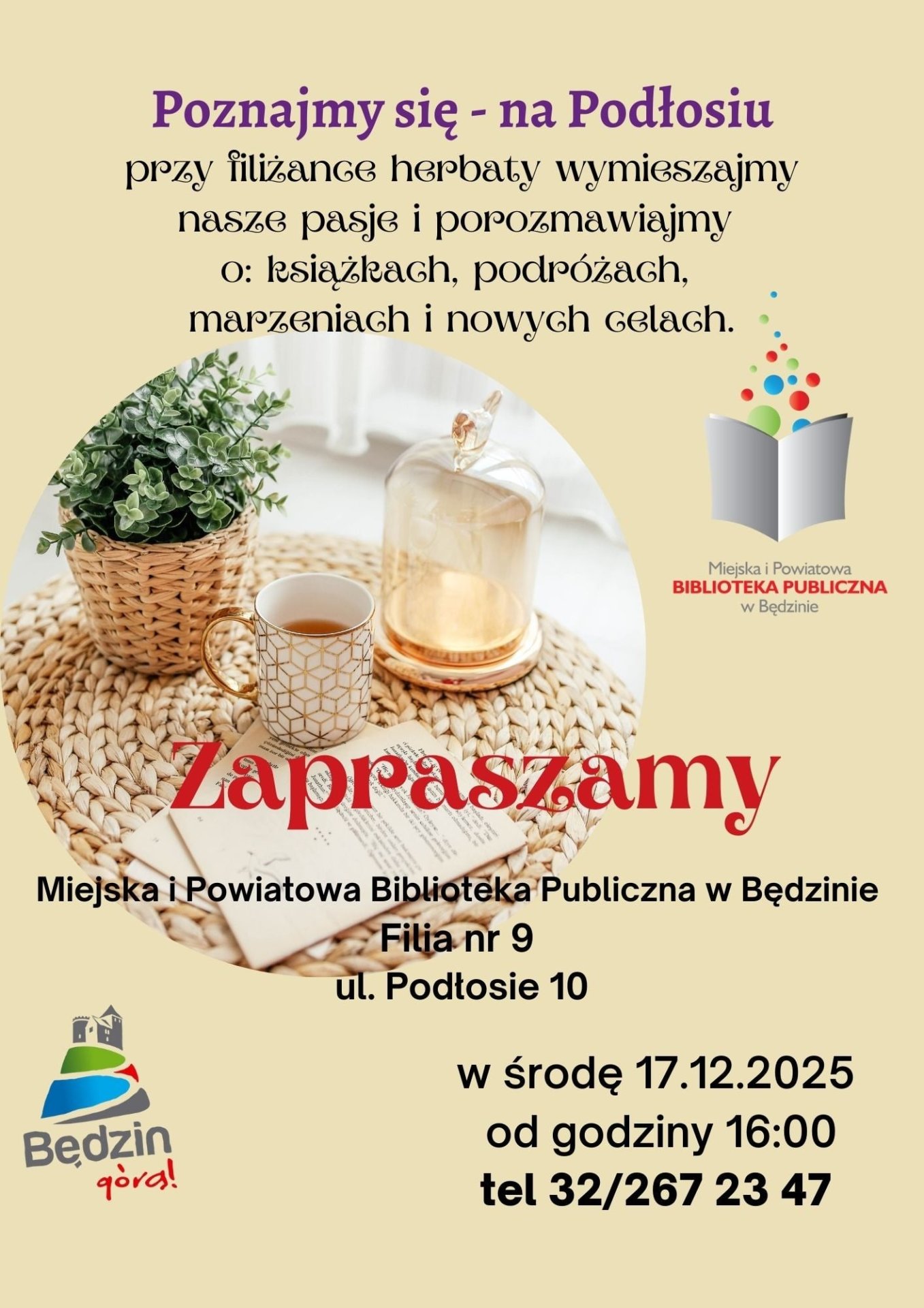 Jeśli macie potrzebę porozmawiania, podzielenia się swoimi sukcesami, uśmiechem czy też opinią na temat ostatnio przeczytanej książki zapraszamy w środę - 17 grudnia od godz.: 16.00 do Filii nr 9 Podłosie.